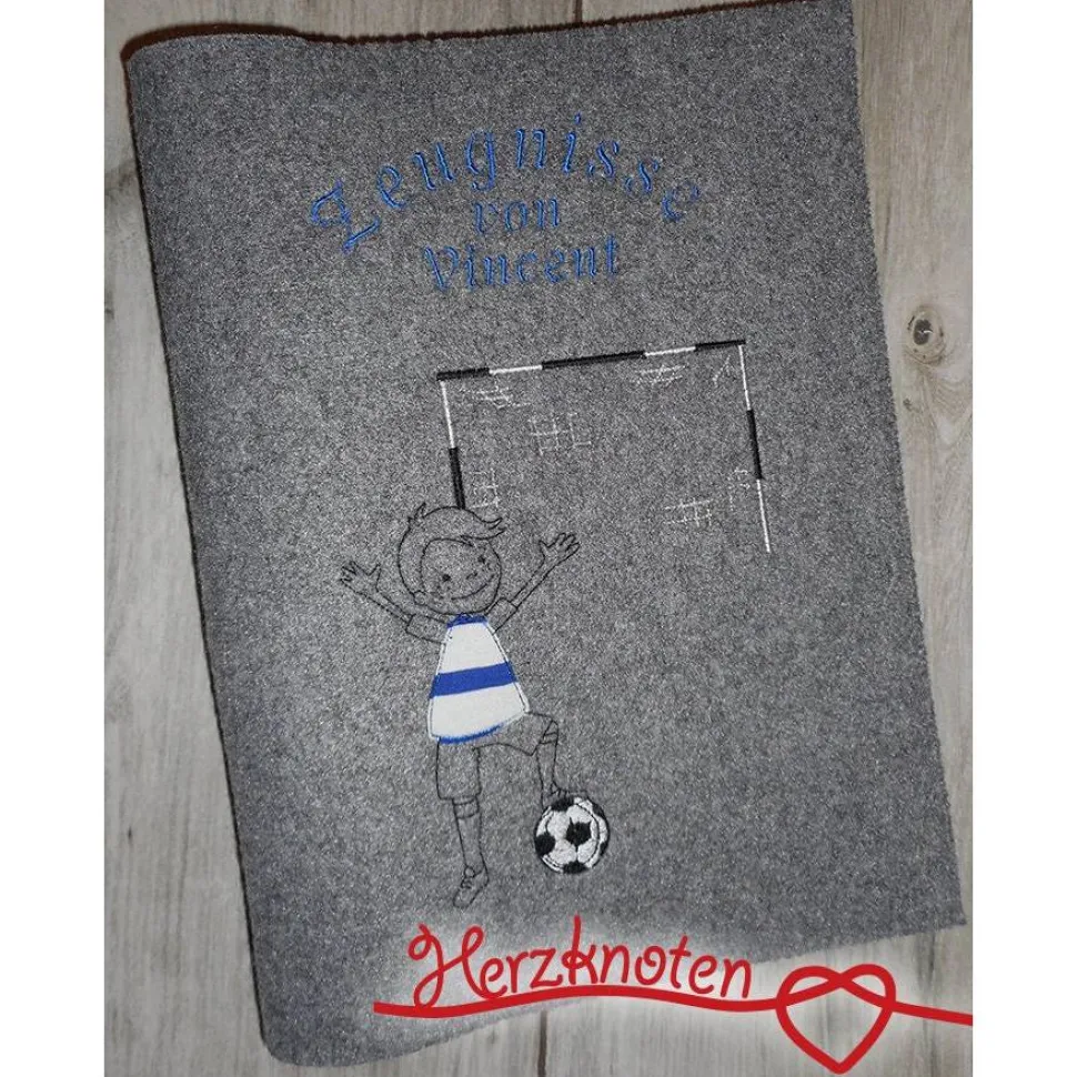 A4 Filzumschlag für Zeugnisse, mit einem Jungen aufgestickt, mit einem Fußball, in doodle Art gestickt mit gewollt fransigen Stoff Appli in der Farbe Deines Lieblingsvereines, mit oder ohne gesticktes Tor, nach einem Motiv von Kunterbuntdesign, innen mit Kunststoffmappe, in der wahlweise 20 oder 40 Klarsichthüllen befestigt sind, paßt perfekt für Zeugnisse. Der Filz besteht aus 100% Polyester und hat die Optik & Haptik von Wollfilz, ist aber stabiler und robuster. Gerne kann ich die Mappe auch mit einer Gummikordel zum verschließen versehen, die Option bitte einfach beim Kauf auswählen.
