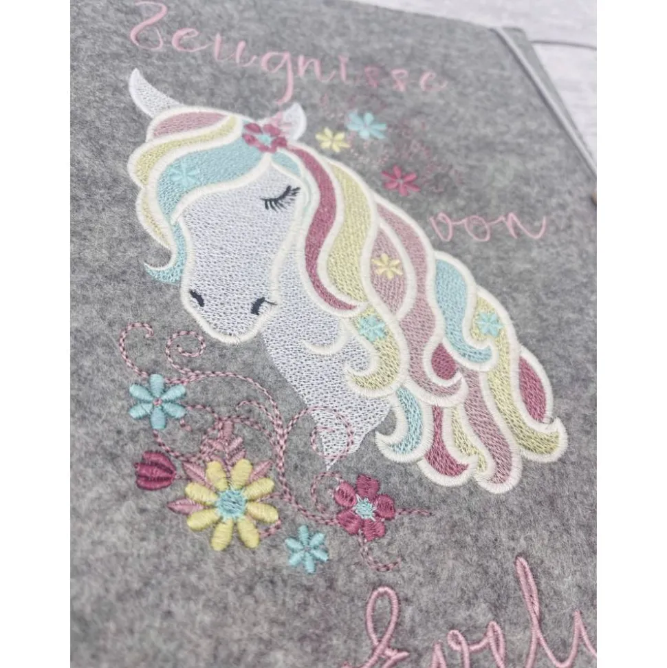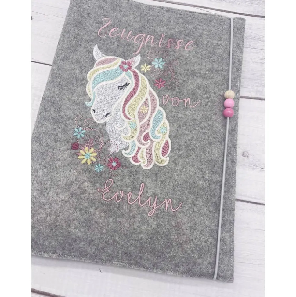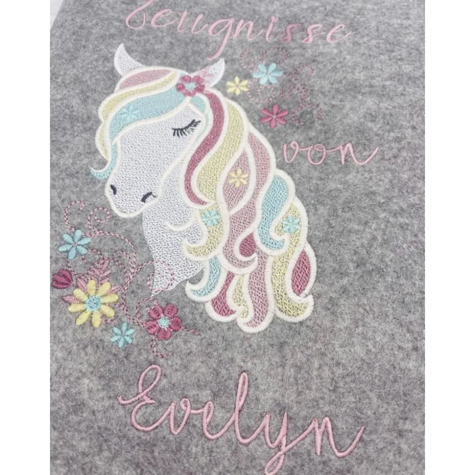Diese hochwertige Zeugnishülle wird aus strapazierfähigem Material gefertigt und ist mit einem wunderschönen gestickten Pferdemotiv verziert. Ihr persönlicher Name wird ebenfalls auf der Hülle angebracht, um sie noch individueller zu gestalten.