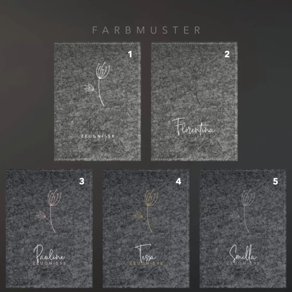 Die edle Zeugnismappe aus Filz bietet dir Platz für bis zu 40 Seiten im Din A4 Format. Du bekommst sie in den Farben Grau oder Anthrazit mit einem einseitig aufgedruckten Design in fünf eleganten Farbkombinationen. Ganz persönlich und unverwechselbar wird die Mappe durch den Aufdruck deines Wunschnamens. Der individuell für dich handgefertigte Filzumschlag enthält eine Verstärkung aus Buchbinderkarton und ein Sichtbuch mit 20 festverschweißten Klarsichthüllen.