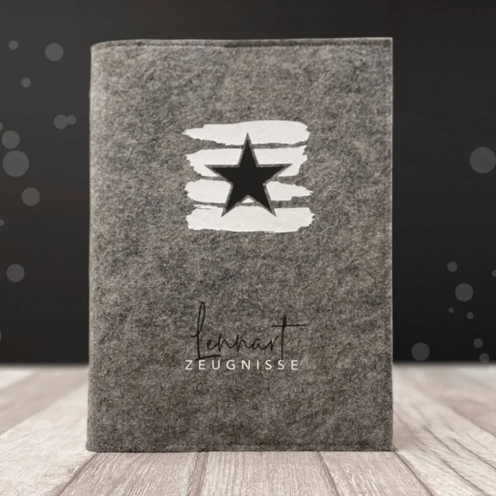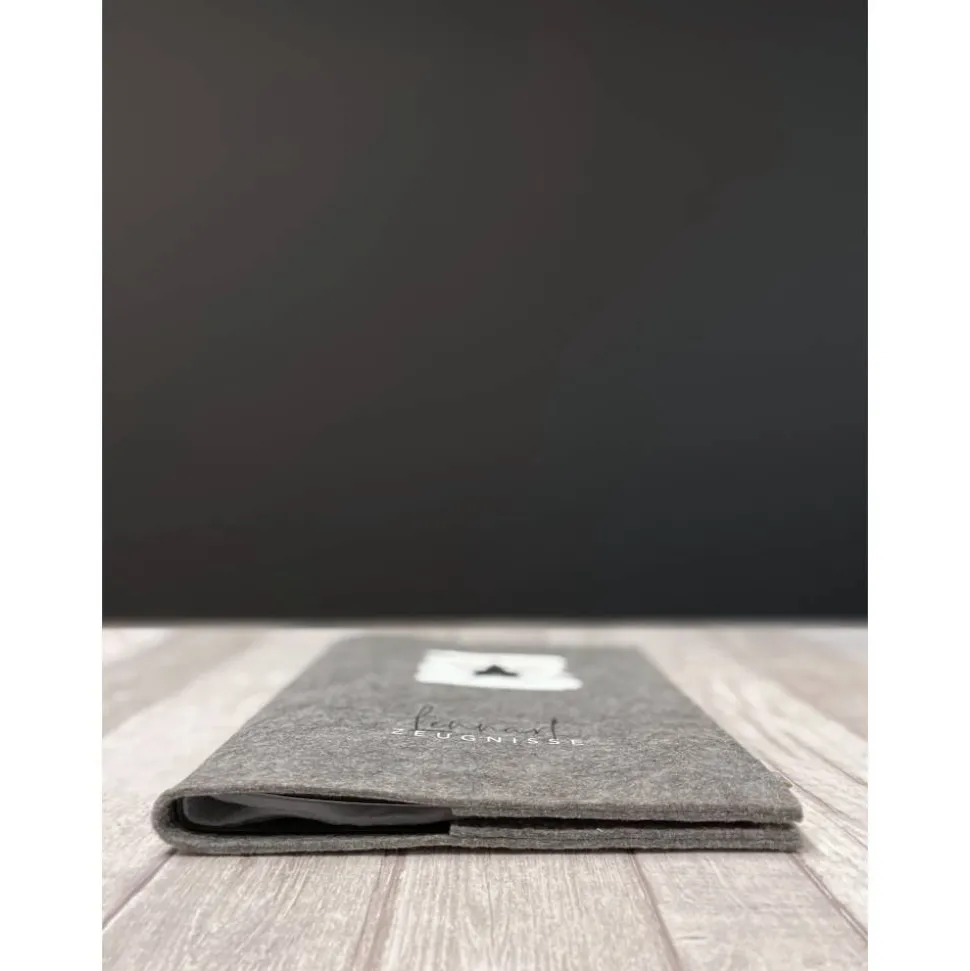 Die edle Zeugnismappe aus Filz bietet dir Platz für bis zu 40 Seiten im Din A4 Format. Du bekommst sie in den Farben Grau oder Anthrazit mit einem einseitig aufgedruckten Design in fünf eleganten Farbkombinationen. Ganz persönlich und unverwechselbar wird die Mappe durch den Aufdruck deines Wunschnamens. Der individuell für dich handgefertigte Filzumschlag enthält eine Verstärkung aus Buchbinderkarton und ein Sichtbuch mit 20 festverschweißten Klarsichthüllen.