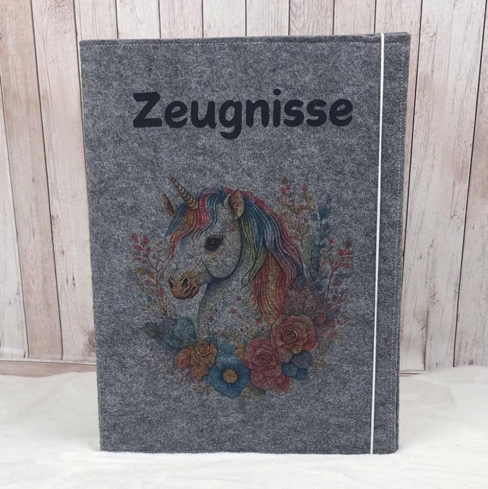 Zeugnismappe aus Filz | Zeugnishülle Einhorn dunkelgrau | Organizer Schule