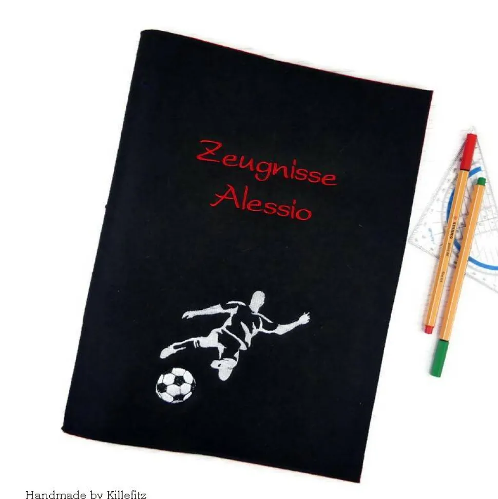 Diese hochwertige DIN A4 Zeugnismappe aus schwarzem Filz wird mit dem Namen deines Kindes bestickt und zeigt einen coolen Fußballer. Damit schenkst du nicht nur ein praktisches, sondern auch ein ganz persönliches Erinnerungsstück zum Schulanfang.
