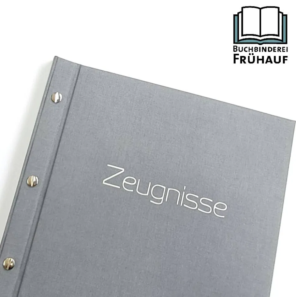 Die Zeugnismappe besteht aus robuster Buchbinderpappe, überzogen mit hochwertigem dunkelgrauem Buchbinderleinen. Der Schriftzug „Zeugnisse“ ist aus Flexfolie gefertigt und sorgt für einen modernen Look.