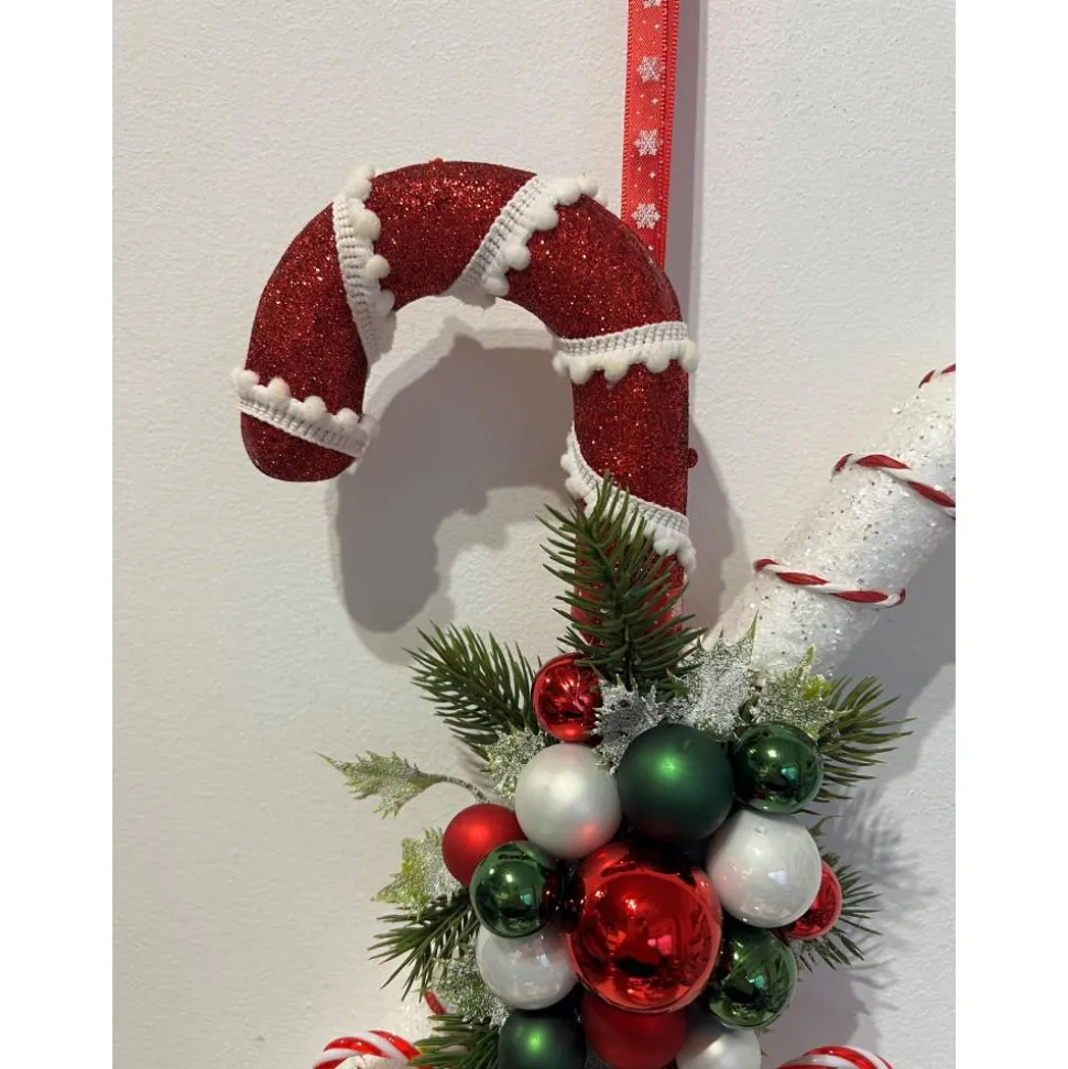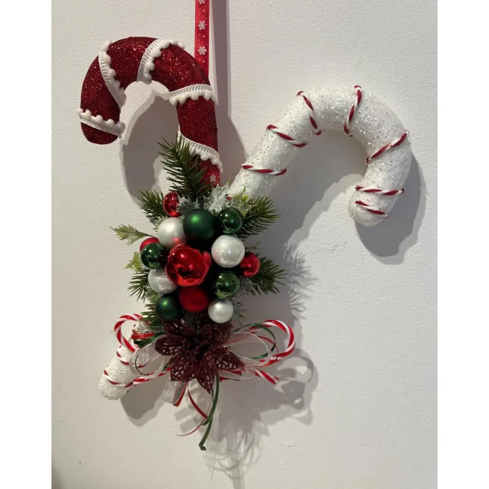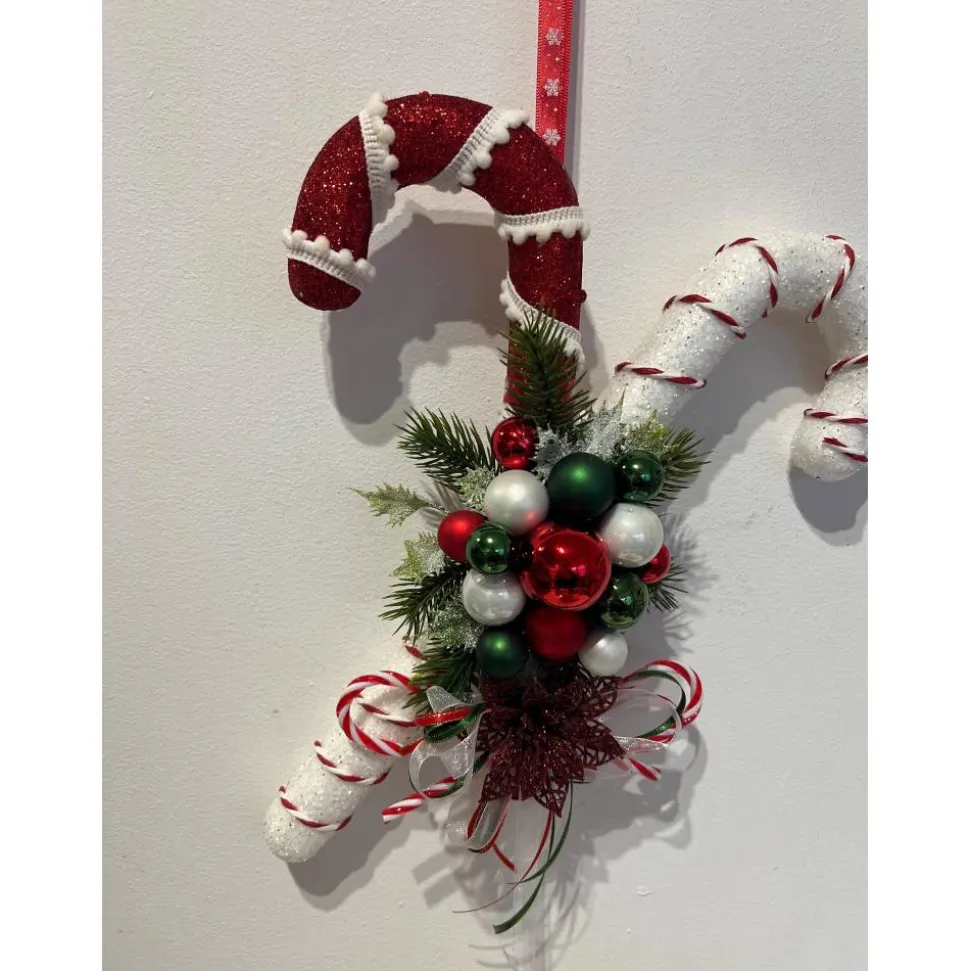 Hier biete ich für die schönste Jahreszeit einen ganz bezaubernden Tür- oder Wandschmuck an, der aus Zuckerstangen, Glaskugeln, künstlicher Tanne und weihnachtlichen Accessoires besteht, den ich mit sehr viel Liebe zum Detail hergestellt habe 🙂