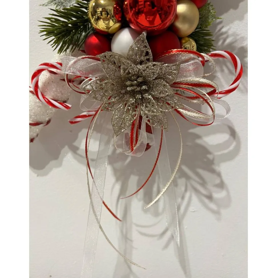 Hier biete ich für die schönste Jahreszeit einen ganz bezaubernden Tür- oder Wandschmuck an, der aus Zuckerstangen, Glaskugeln, künstlicher Tanne und weihnachtlichen Accessoires besteht, den ich mit sehr viel Liebe zum Detail hergestellt habe 🙂