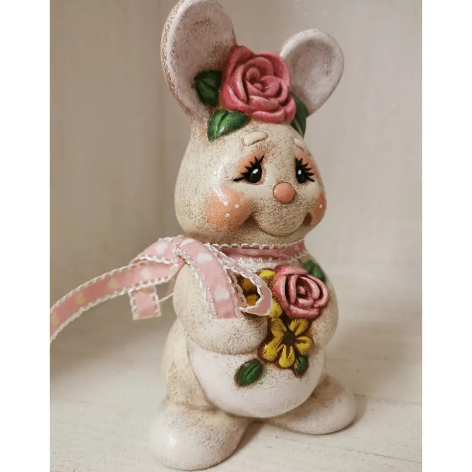 Der Hase ist aus Keramik, ca 21cm hoch. Handbemalt mit sehr viel Liebe zum Detail und mit einem Zuckersüsse Schleifchen dekoriert. Verwendet hab ich dafür Acrylfarben und abschließend zweimal wetterfest versiegelt. Das Häschen kann draussen stehen, sollte aber vor Frost geschützt werden.