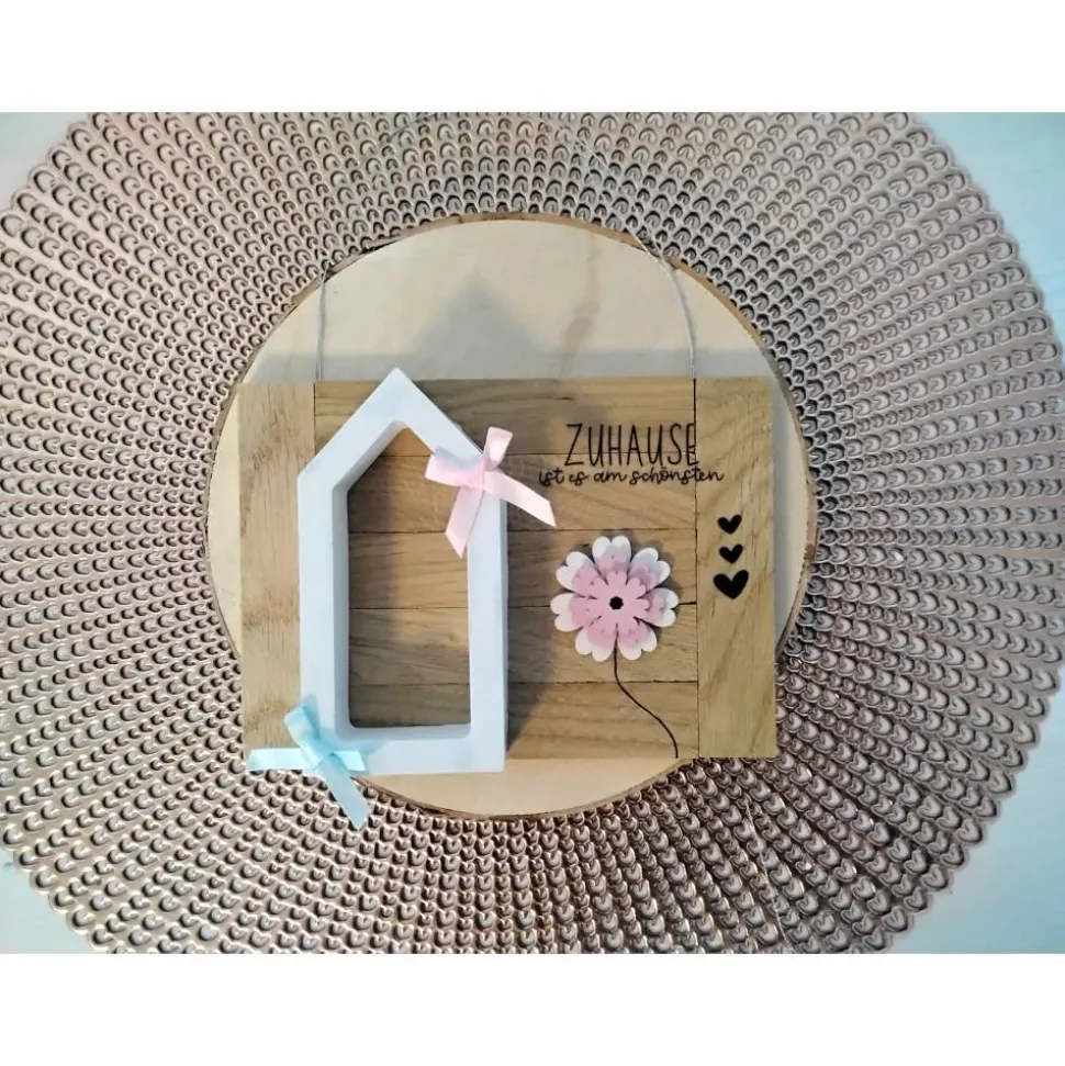 Es besteht aus einem Holzuntersetzer, auf welchem ein Keramik-Häuschen (Hier zu sehen in der Farbe “ Blau „) angebracht wurde. Rechts oben wurde der Text „Zuhause ist es am schönsten“ mittels Transfersticker/Rub-On angebracht.