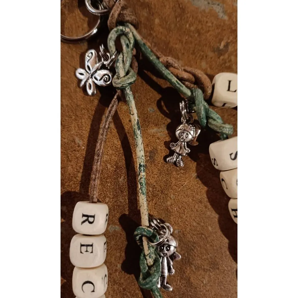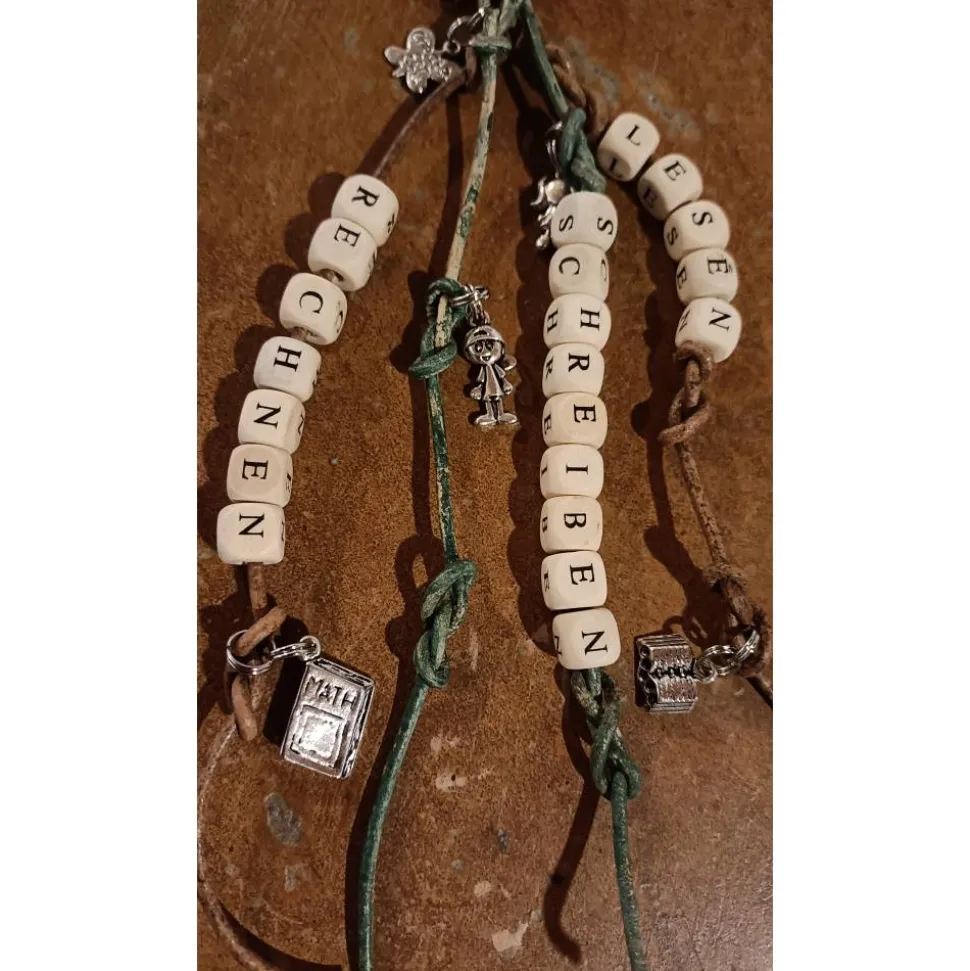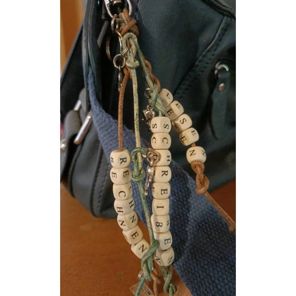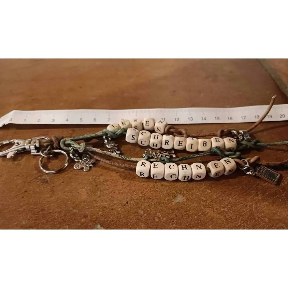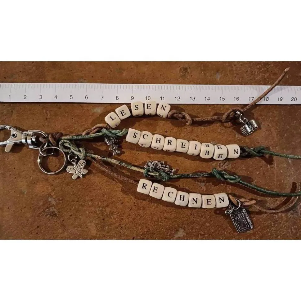 Der etwa 20 cm lange Taschenanhänger ist mit einem 38 mm langen, hell silberfarbenen Karabiner mit Drehwirbel und einem kleinen Schlüsselring ausgestattet. Das grüne und das braune Lederband im Vintage-Look wird jeweils verziert durch passende Metallcharms: einem kleinen Mädchen und Jungen, einem Mathe- und Lesebuch sowie einem Schmetterling mit dem Logo ‚created for you‘. Das Thema, der Schulanfang, wird durch Buchstabenwürfel aus Holz (etwa 9 mm) mit den Worten LESEN SCHREIBEN RECHNEN verdeutlicht. Der Anhänger kann an einem Sportbeutel oder einer Schultasche als Zierde dienen.