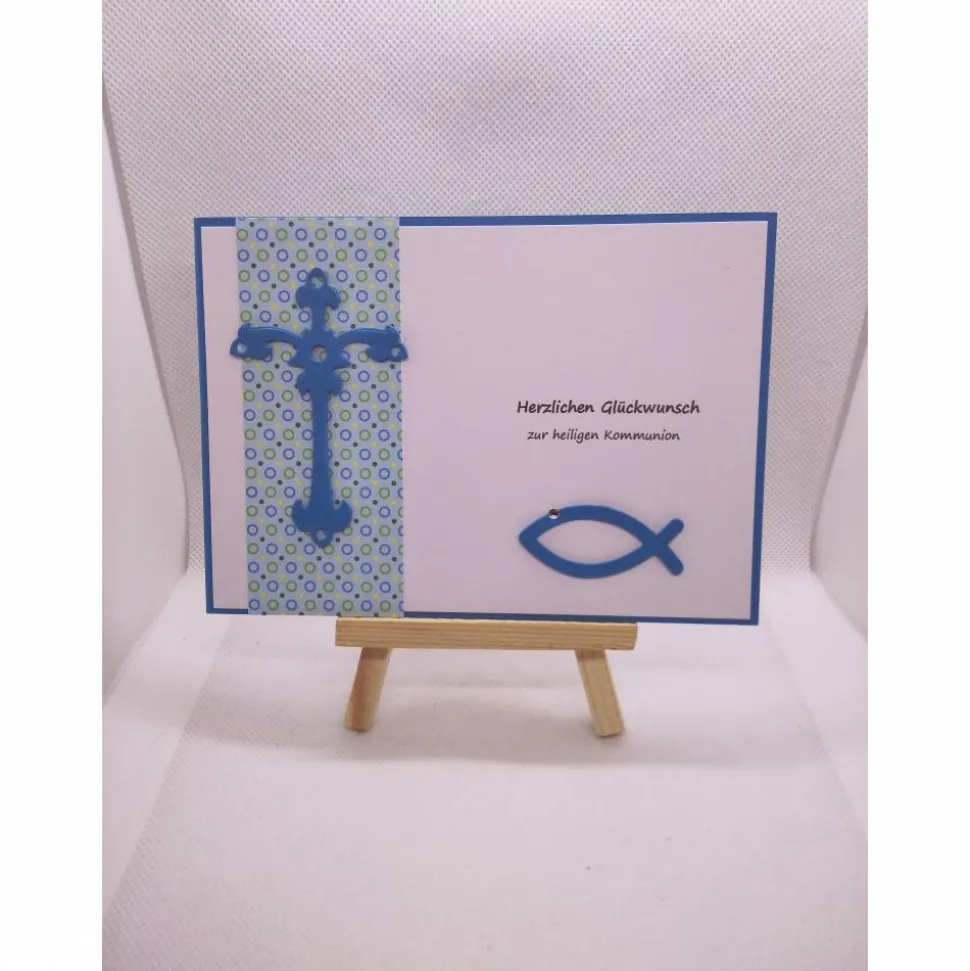 Blaue Grundkarte aus 210 g schweren Karton mit Aufleger, Motiv Kreuz und Fisch- alles in blau/ weißgehalten, Text: „Herzlichen Glückwunsch zur Heiligen Kommunion“