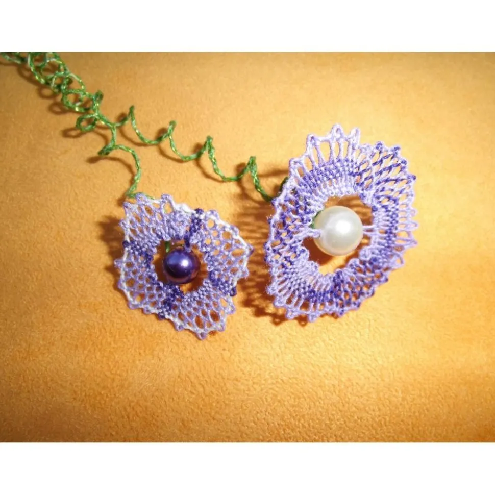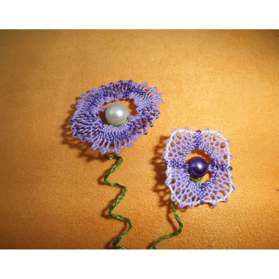 Die Blumen wurden aus Baumwollgarn in verschiedenen Lilatönen (alternativ Rosatöne) und Hellgrün von Hand geklöppelt.