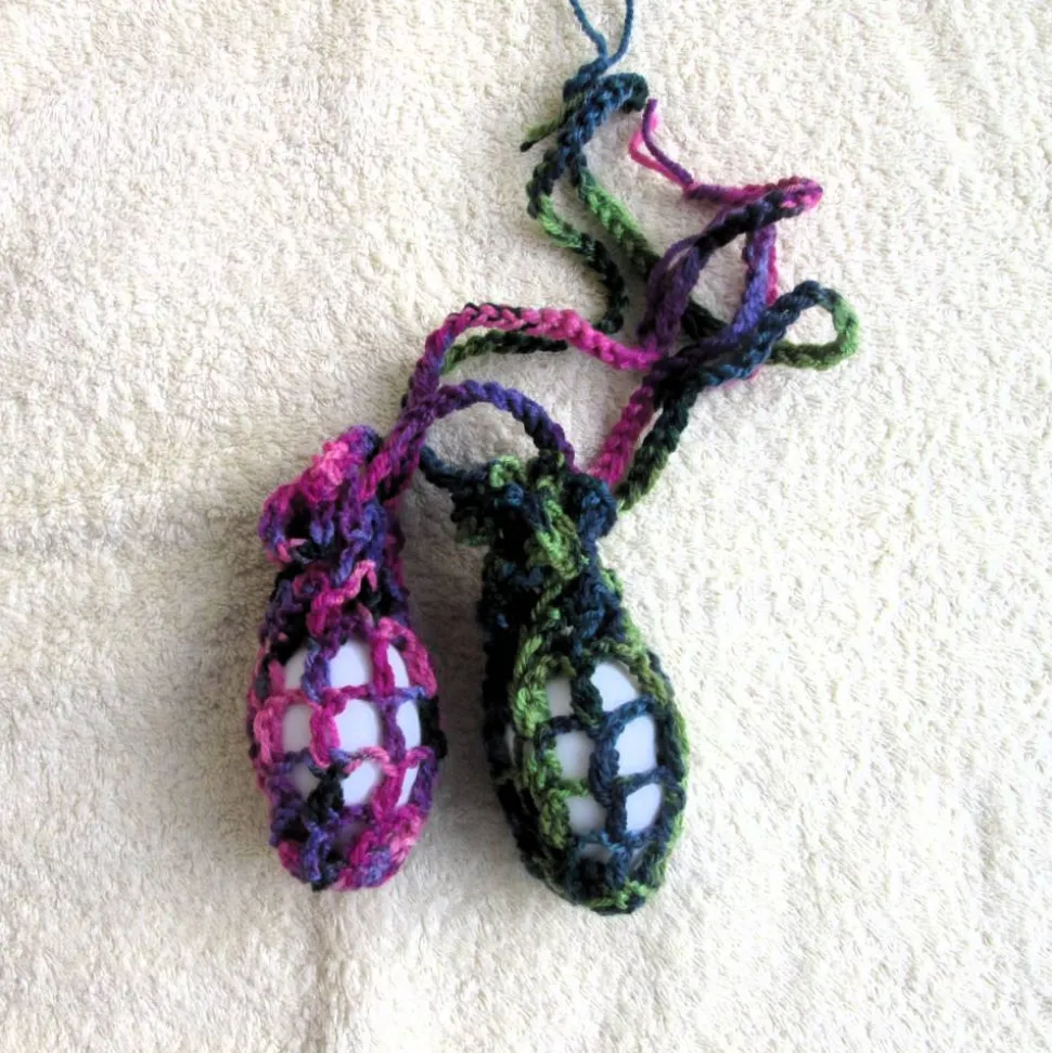 Gehäkelt aus weicher Polyacrylwolle. Das Netz wird durch eine Kordel verschlossen mit der man auch schleudert