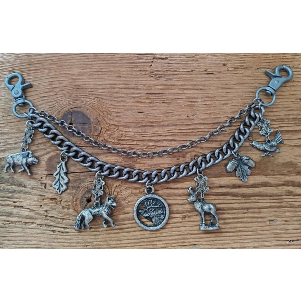 mit 7 fest angebrachten, sehr hochwertigen Trachtenanhängern zum Thema „Jäger“ aus Metall
