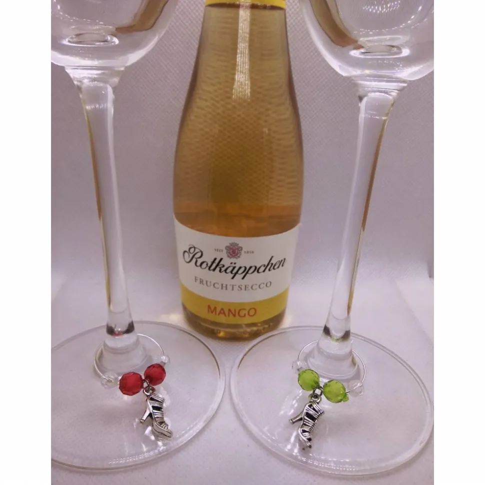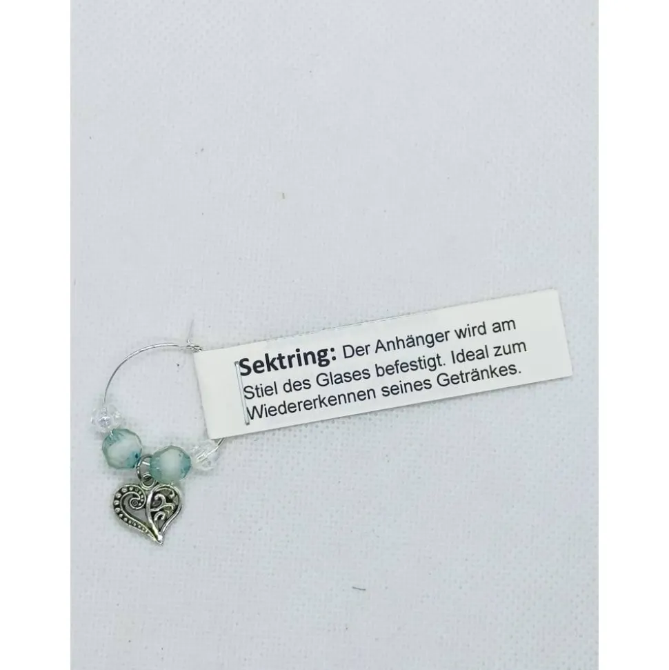 Wiederverschließbarer Markierungsring, der mit bunten Acrylperlen bestückt ist und jeweils einen Anhänger „verschiedene Motive möglich“ in der Mitte haben. Die Ringe können um jedes Stielglas gelegt werden.