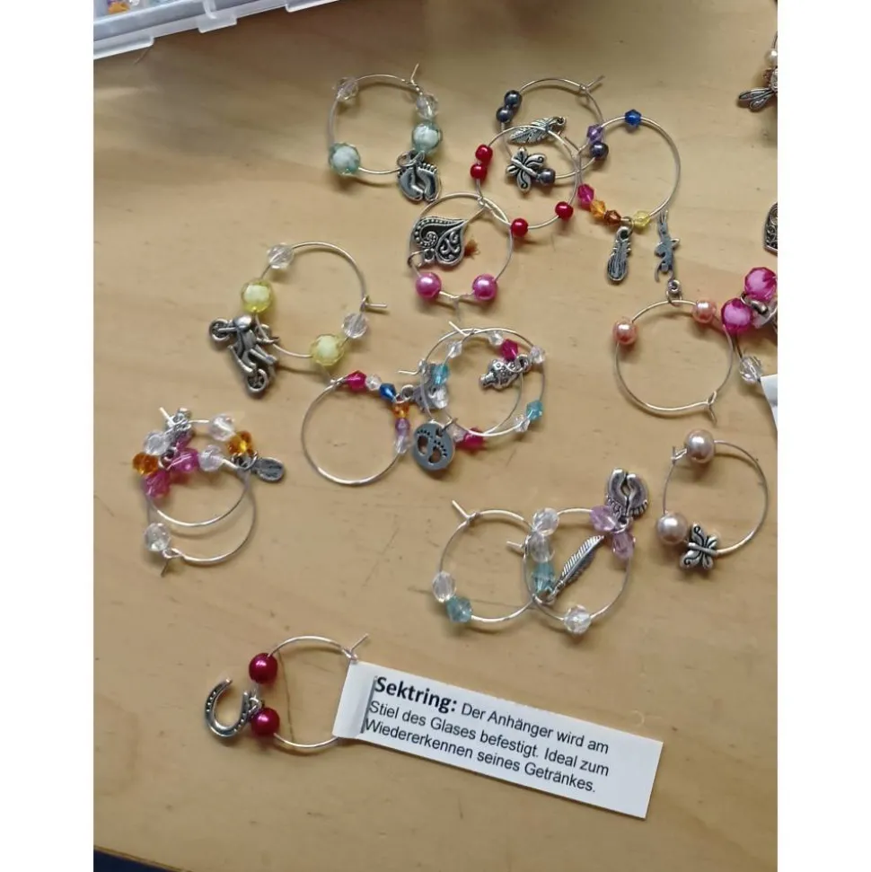 Wiederverschließbarer Markierungsring, der mit bunten Acrylperlen bestückt ist und jeweils einen Anhänger „verschiedene Motive möglich“ in der Mitte haben. Die Ringe können um jedes Stielglas gelegt werden.