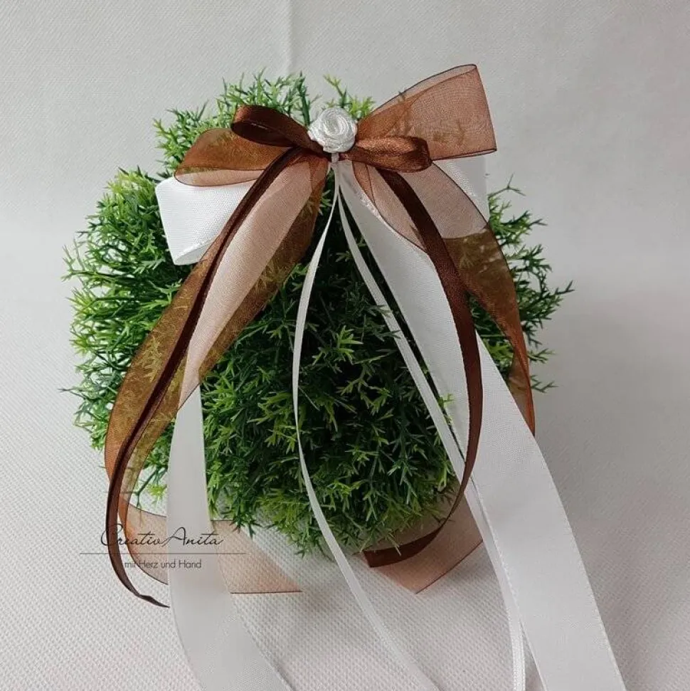 Zur Anfertigung der Autschleifen/Antennenschleifen werden 4 unterschiedliche, hochwertige Floristikbänder verwendet. (Satin, Chiffon, Taft – kann je nach Lieferantenangebot variieren!)