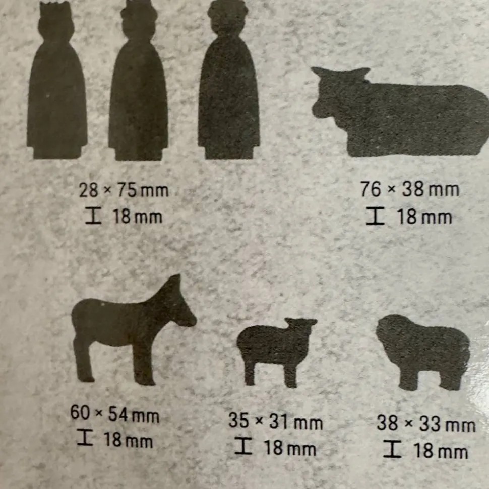 Diese einzigartige Krippe umfasst eine Fülle von Figuren, darunter Maria, Joseph, das Jesuskind, die Heiligen drei Könige sowie den Ochsen, Esel, Schaf und Schafbock. Das Holztablett hat eine Breite von etwa 34 cm und eine Tiefe von 16 cm.