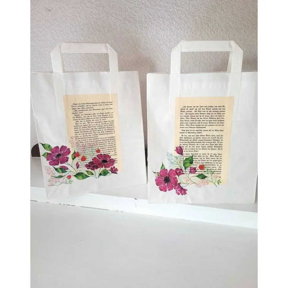 weiße Henkeltüten wurden von mir in Serviettentechnik verziert …
