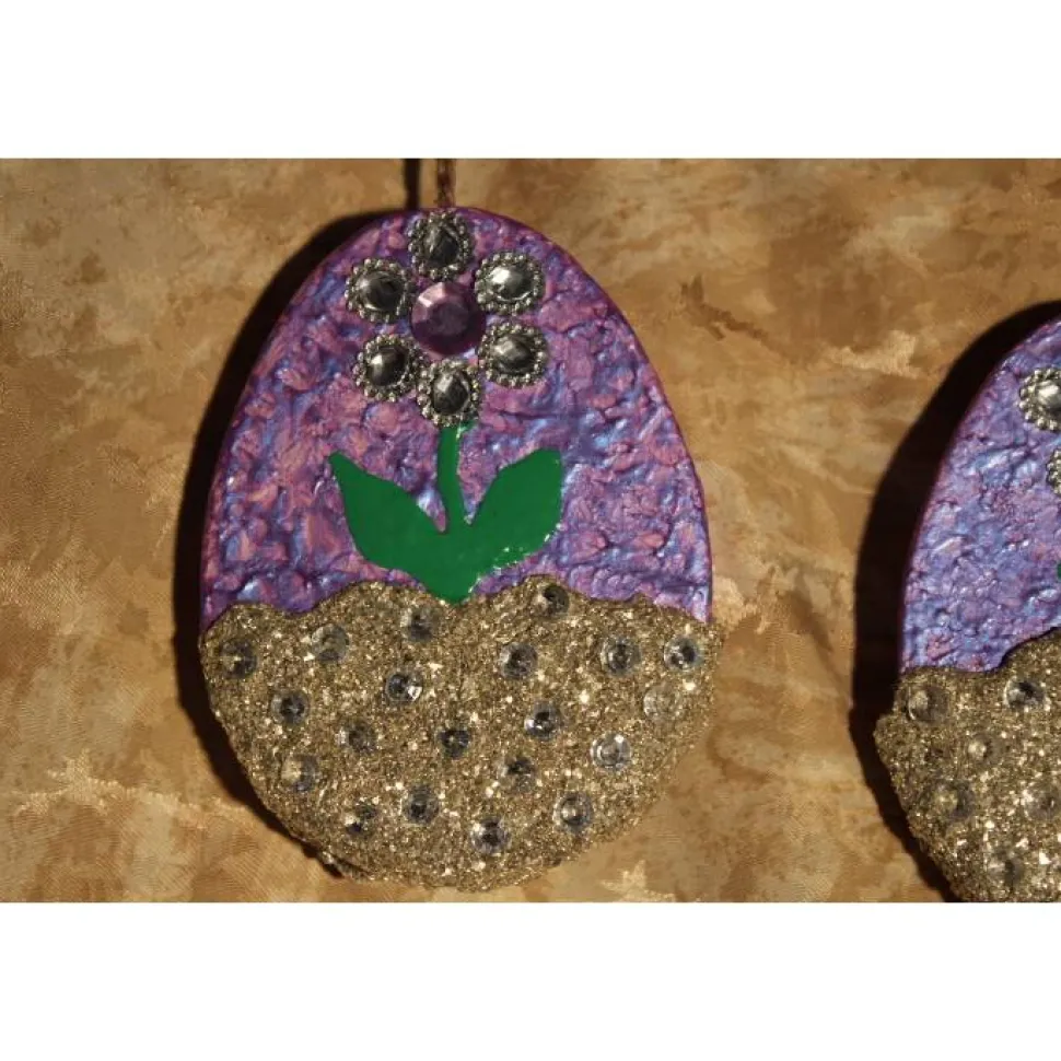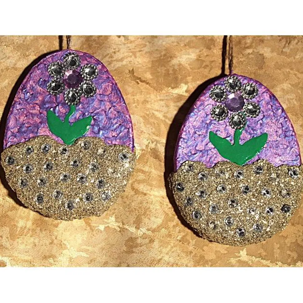 Zwei kleine, abstrakte Gestaltungen in den Farben Lila, Grün und Silber. Die kleinen flachen Eier sind beidseitig gestaltet und mit herrlich schillernden Glitzersteinen und Glitter beklebt.
