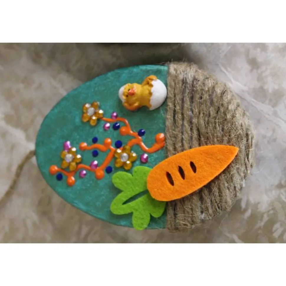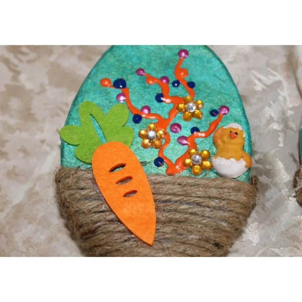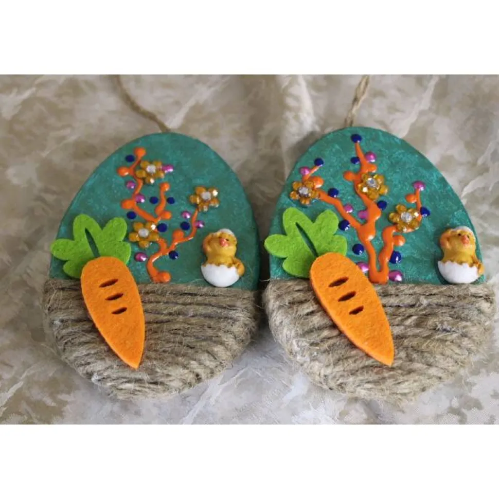 Die kleinen flachen Eier sind beidseitig gestaltet und mit Küken aus Polyresin, sowie Karotten aus Filz beklebt.