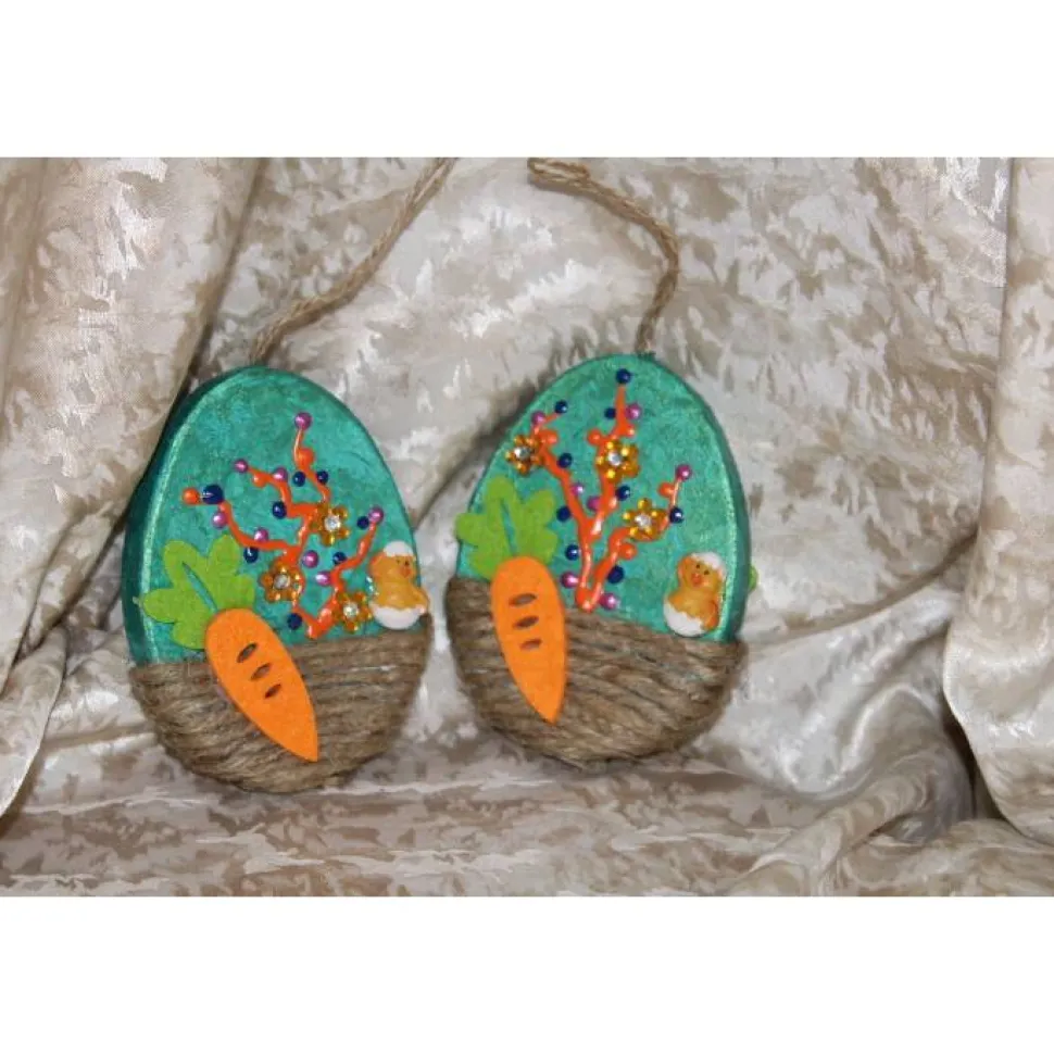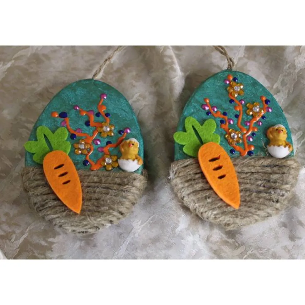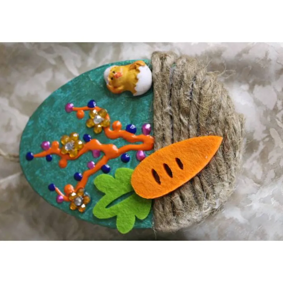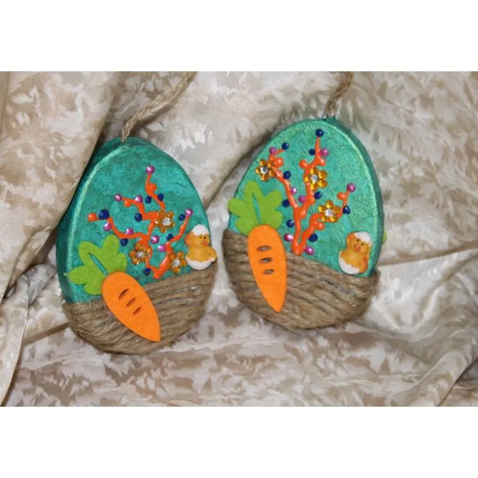 Die kleinen flachen Eier sind beidseitig gestaltet und mit Küken aus Polyresin, sowie Karotten aus Filz beklebt.