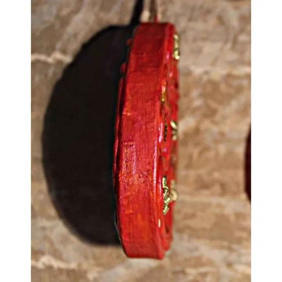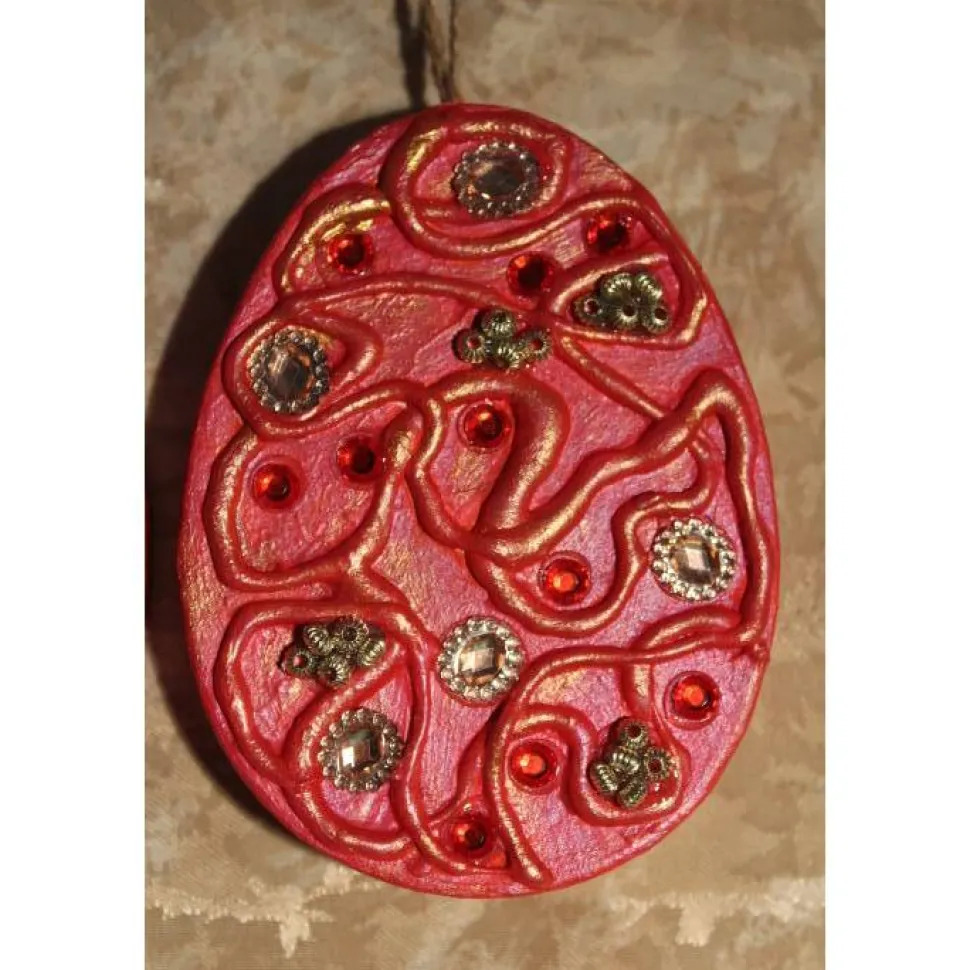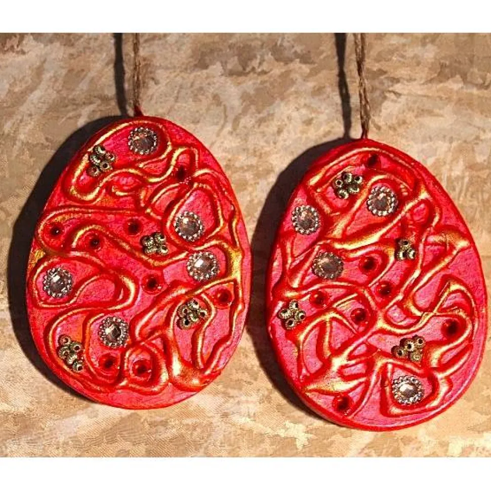Zwei kleine, abstrakte Gestaltungen in den Farben Rot und Gold. Die kleinen flachen Eier sind beidseitig gestaltet und mit herrlich schillernden Glitzersteinen beklebt.