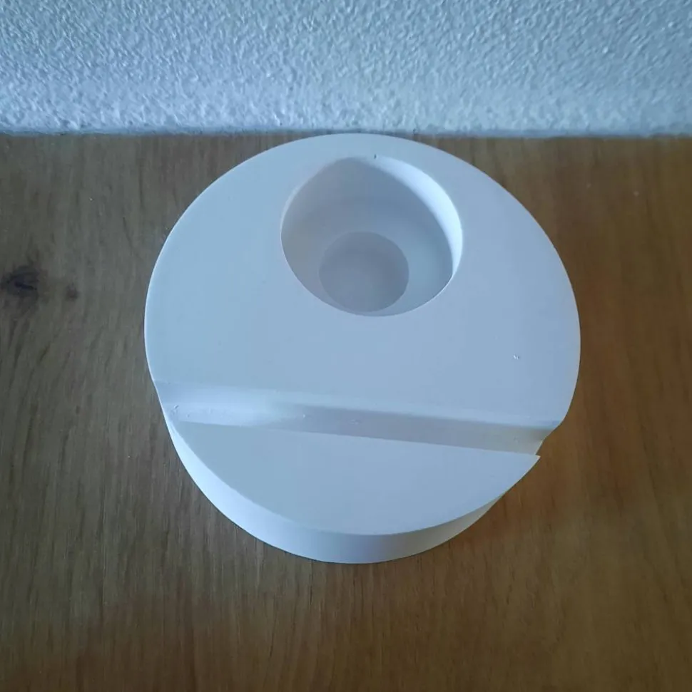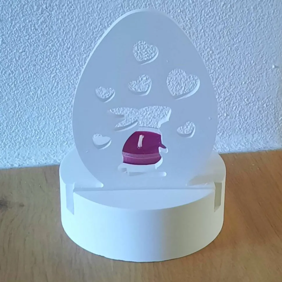 Der Kerzenhalter hat vorne eine Vertiefung, in die verschiedene Motive eingeschoben werden.