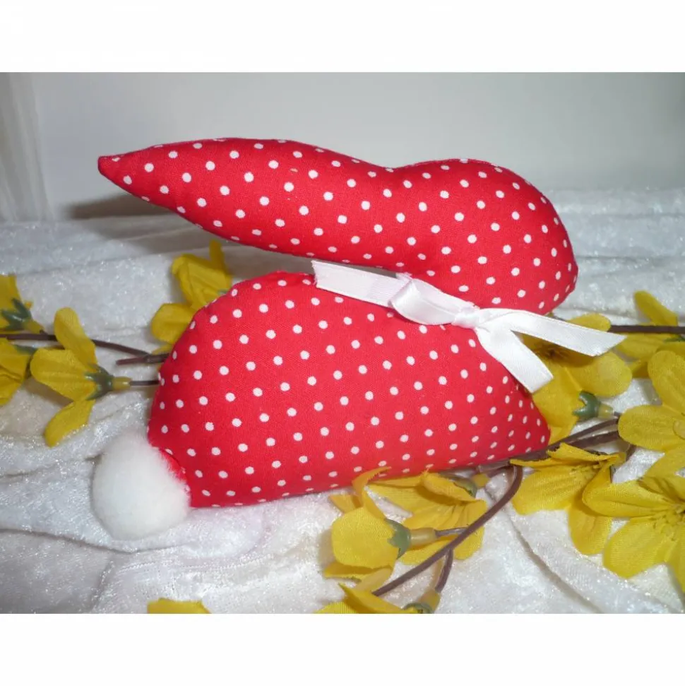 Die Hasen sind aus rot-weiss gepunktetem Baumwollstoff genäht und mit Füllwatte gestopft.