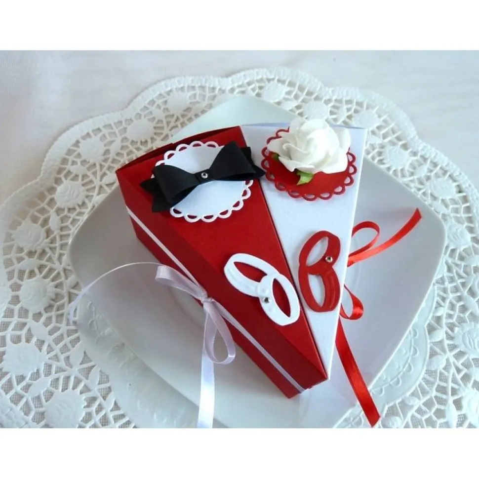 Das Angebot beinhaltet je ein Tortenstück in rot und weiß mit Röschen und Fliege.