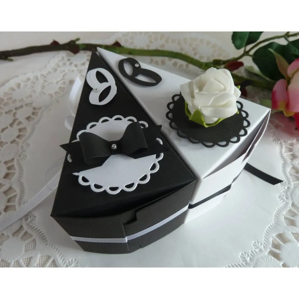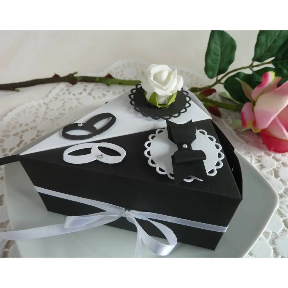 Das Angebot beinhaltet je ein Tortenstück in schwarz und weiß mit Röschen und Fliege.