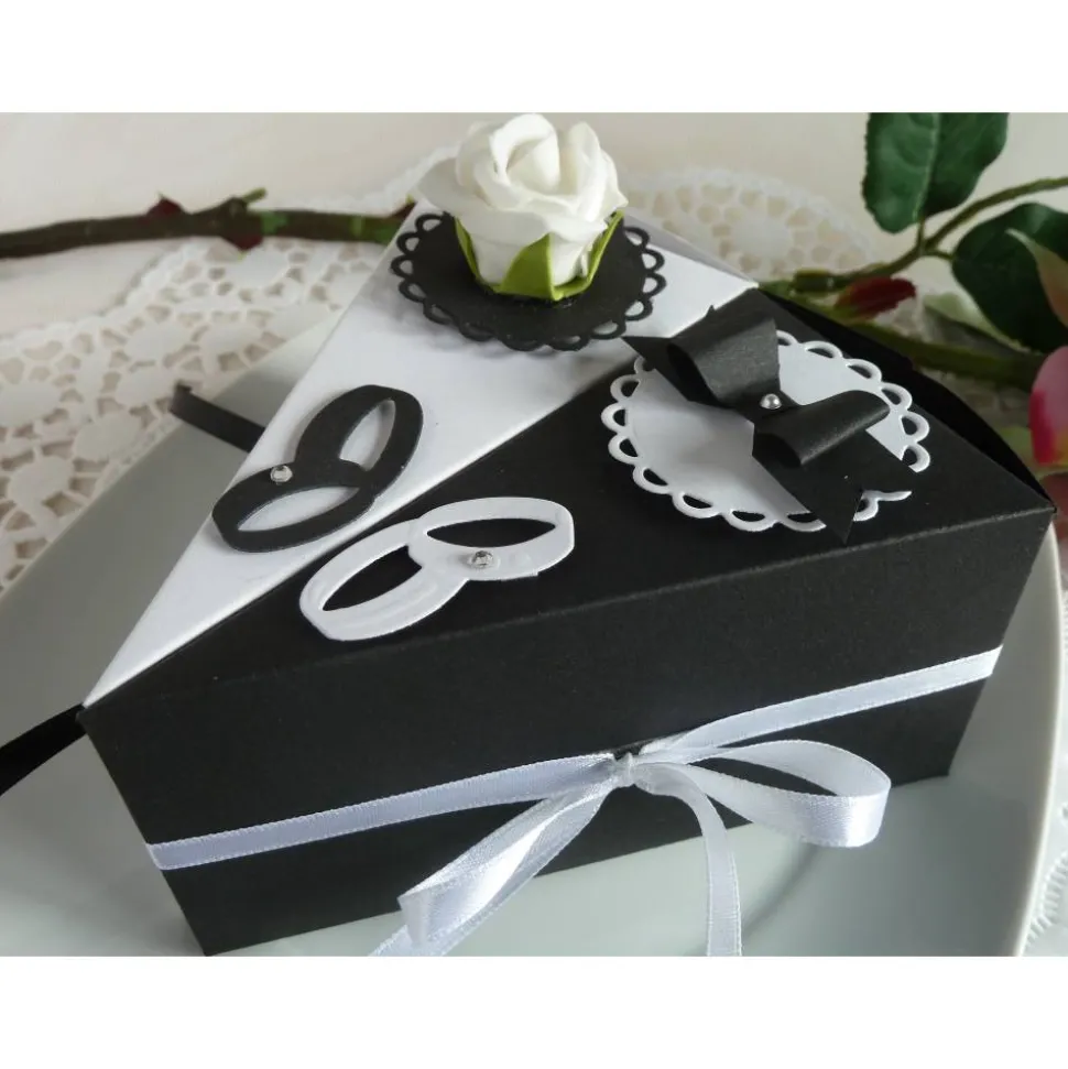 In diesen Tortenstücken aus Tonkarton, dekoriert mit Satinschleife, Fliege, Röschen und ausgestanzten Ringen mit Glitzerstein, kannst du dekorativ Geld zur Hochzeit verschenken.