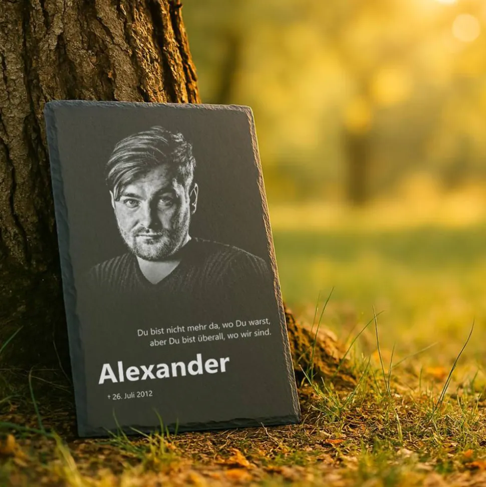 Schaffe eine bleibende Erinnerung mit einem individuellen Gedenkstein: Die 20 x 15 cm Schiefertafel inkl. Gravur ist die perfekte Wahl als persönlicher Grabschmuck. Jede Gedenktafel wird nach deinen Wünschen graviert – mit Foto, Wunschtext und auf Wunsch kleinen Symbolen. So gestaltest du eine einzigartige Grabtafel, die liebevoll an einen besonderen Menschen erinnert.