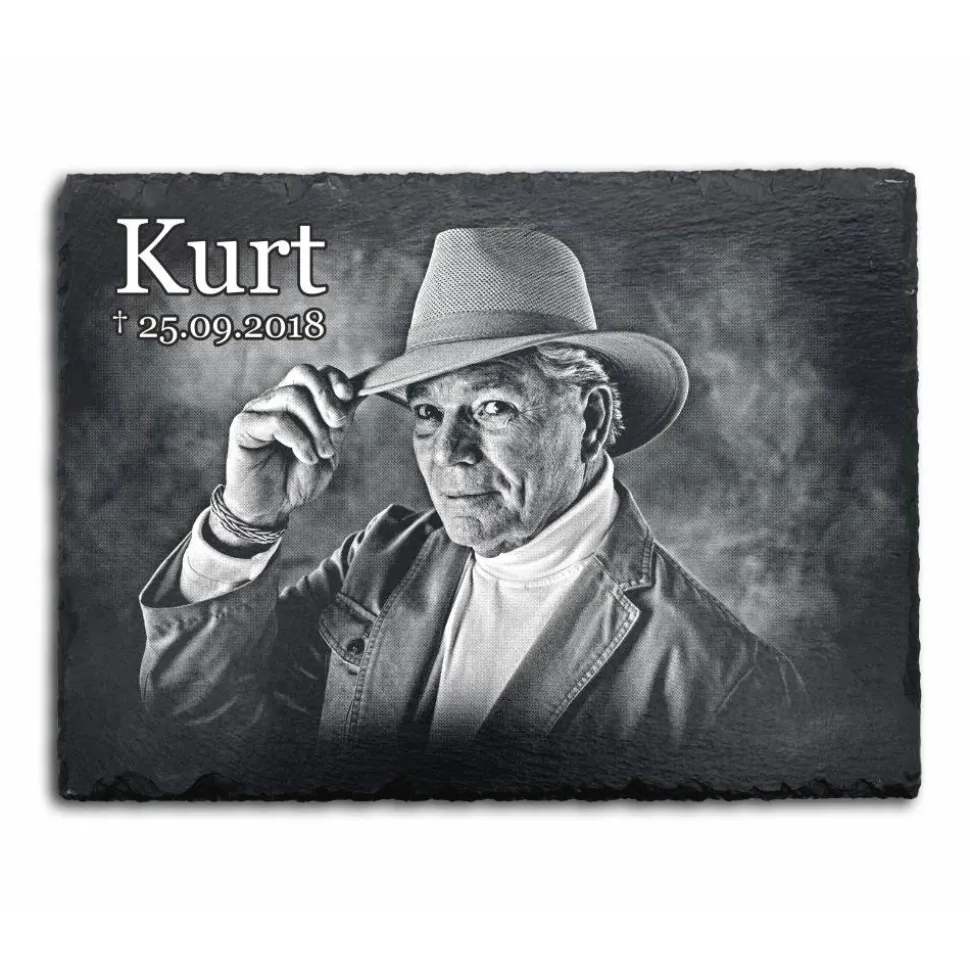 Wichtige Hinweise: Schiefer ist ein Naturprodukt, daher können kleine Unregelmäßigkeiten vorkommen. Für die beste Gravurqualität sende dein Bild möglichst im Original. Unsere Schieferplatten sind mit einer speziellen Lasur versiegelt und somit zuverlässig wetterfest.