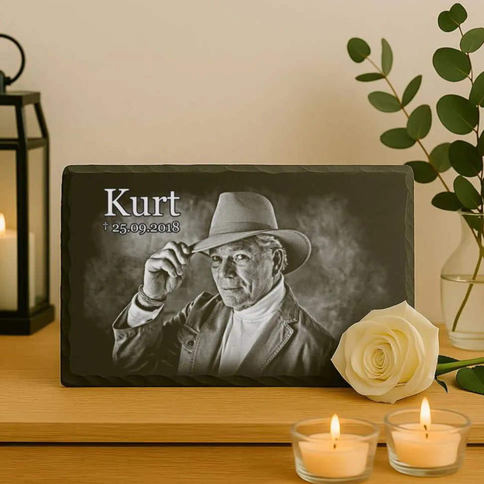 Schaffe eine bleibende Erinnerung mit einem individuellen Gedenkstein: Die 20 x 15 cm Schiefertafel inkl. Gravur ist die perfekte Wahl als persönlicher Grabschmuck. Jede Gedenktafel wird nach deinen Wünschen graviert – mit Foto, Wunschtext und auf Wunsch kleinen Symbolen. So gestaltest du eine einzigartige Grabtafel, die liebevoll an einen besonderen Menschen erinnert.