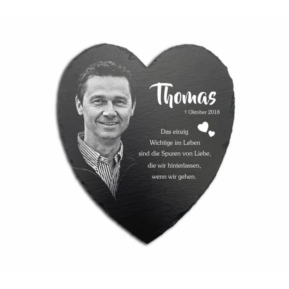 Schaffe eine bleibende Erinnerung mit einem individuellen Gedenkstein: Das 20 x 23 cm Schieferherz inkl. Gravur ist die perfekte Wahl als persönlicher Grabschmuck. Jedes Schieferherz wird nach deinen Wünschen graviert – mit Foto, Wunschtext und auf Wunsch kleinen Symbolen. So gestaltest du eine einzigartige Grabtafel, die liebevoll an einen besonderen Menschen erinnert.