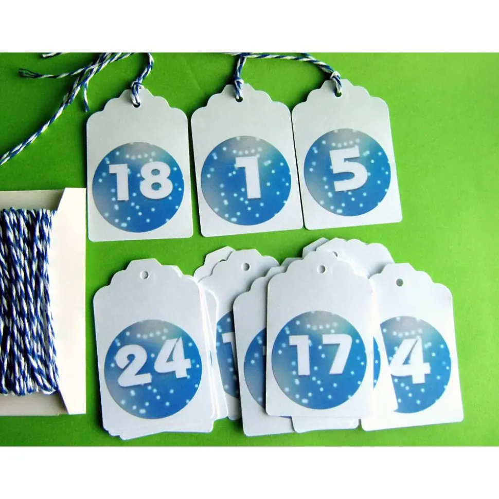 Mit Bäckergarn blau – weiß zum Aufhängen der Adventskalenderzahlen Anhänger.