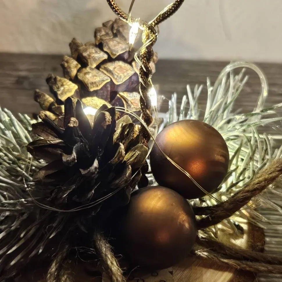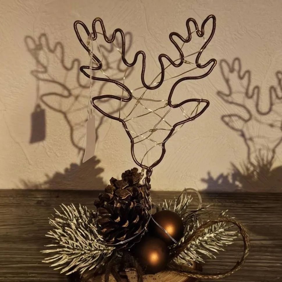 Immer zwei Stück. Rentierkopf aus Aluminiumdraht auf einer Baumscheibe mit farblich passender Weihnachtsdeko. Eine Led-Lichterkette sorgt für die stimmungsvolle Beleuchtung. Höhe mind. 16 cm. Jedes ist ein Unikat, deshalb kann die Dekoration vom Bld abweichen. In 4 Farbn erhältlich.