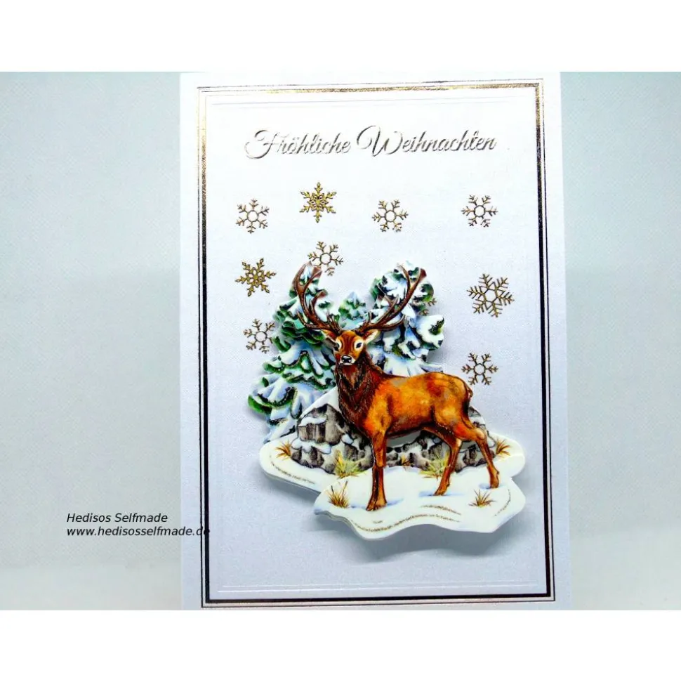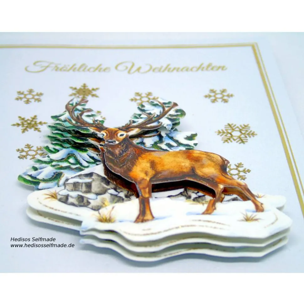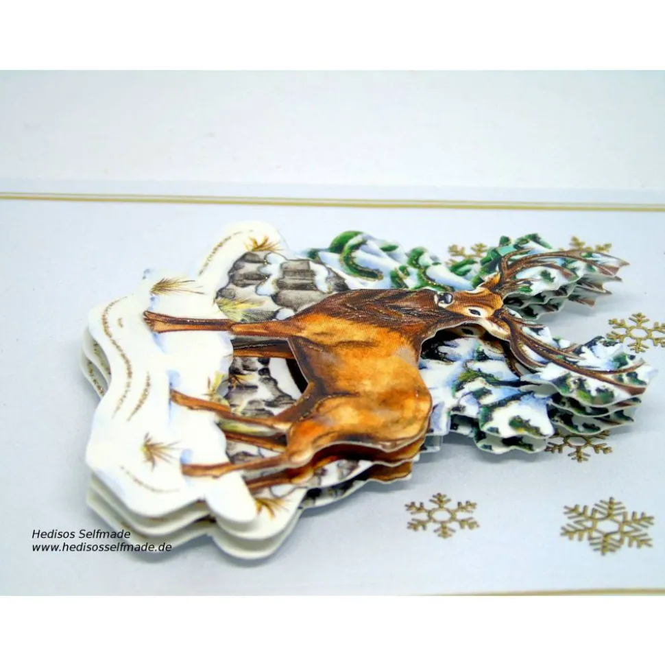 Das Motiv eines Hirsches in einem verschneiten Winterwald vor leise fallenden goldenen Schneeflocken wurde in 3-D-Optik aufgebracht.