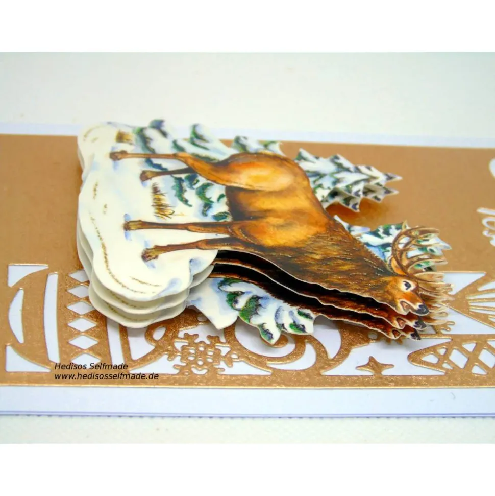 Das Motiv eines Hirsches in einem verschneiten Winterwald wurde auf eine wundervollen kupferfarbenen Hintergrund mit Weihnachtsmotiven in 3-D-Optik aufgebracht.
