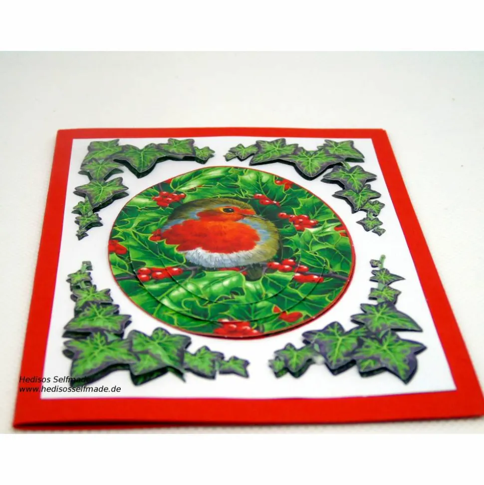 Eine Weihnachtskarte mit einem Vogel im Efeu, liebevoll und aufwendig in Handarbeit gearbeitet. Das spricht für eine einzigartige Karte für einzigartige Menschen.