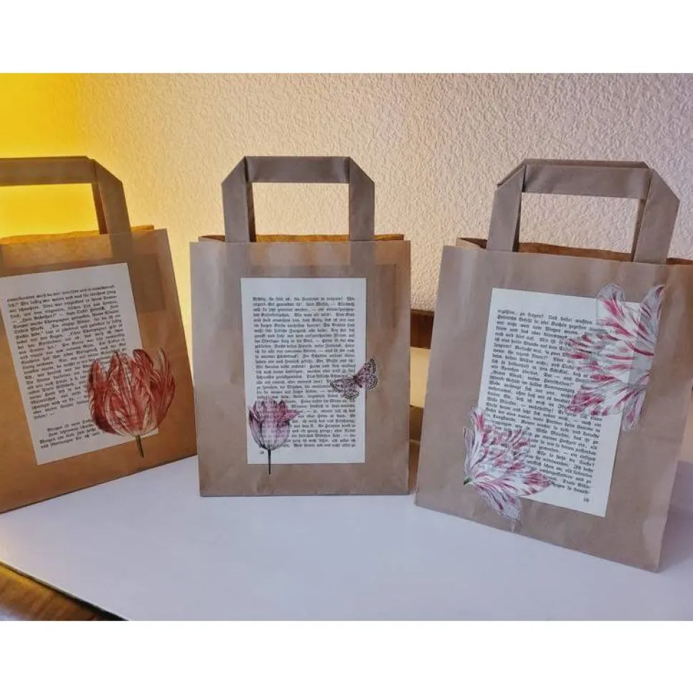auf der Vorderseite sind sie liebevoll mit einer ausgelesenen Buchseite und floralem Motiv in Serviettentechnik verziert …