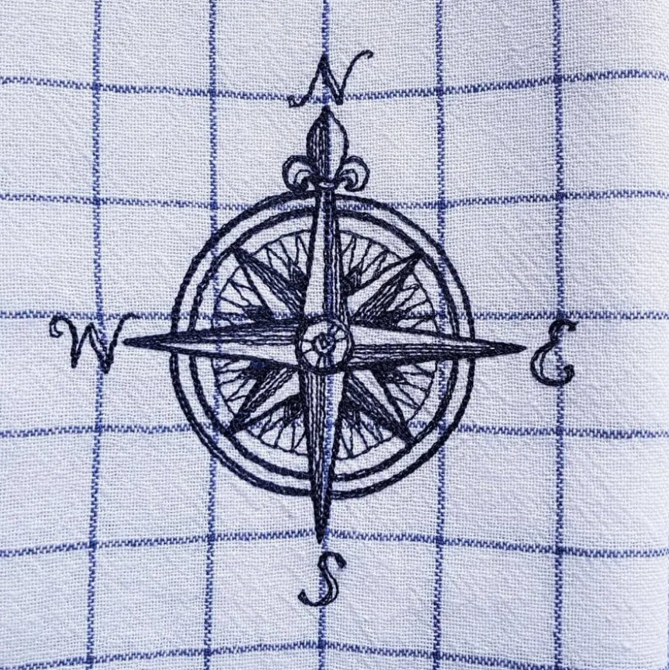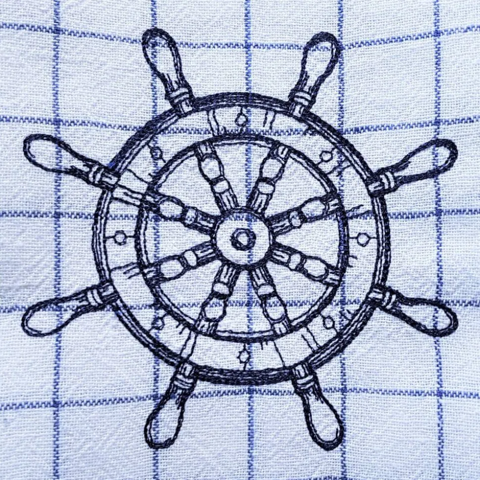 Die Tücher sind blau weis und mit einem Compass, Anker und einem Steuerrad in dunkelblau bestickt.