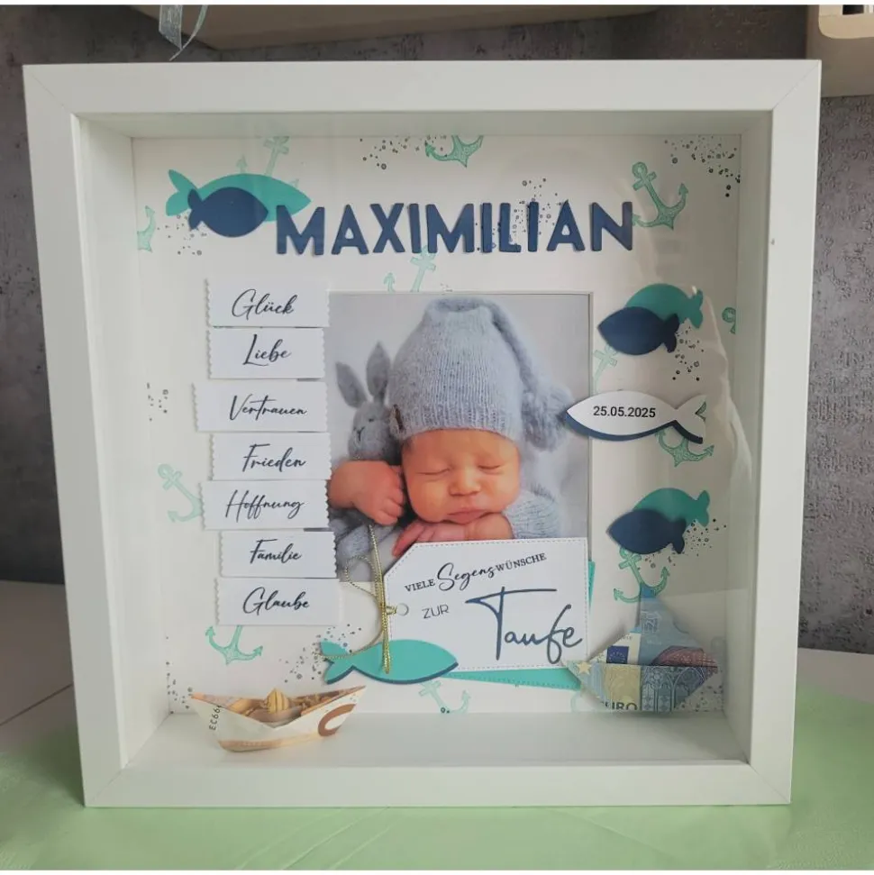 Der Rahmen eignet sich zum Aufstellen oder Aufhängen. So schafft man eine tolle Erinnerung an das schöne Ereignis. Es kann ein Foto vom Taufkind im Rahmen angebracht werden.