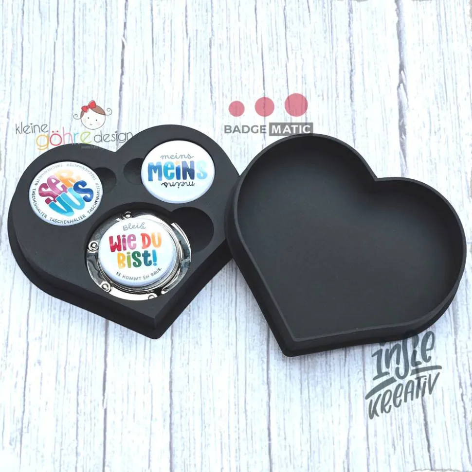 Entdecke die perfekte 3D Druck Buttonbox in Herzform für deine Badgematic Taschenhalter! Diese speziell angepasste Box bietet Platz für deinen Taschenhalter sowie zwei Wechselbutton und ist somit ideal als individuelle Verpackung oder Geschenkbox geeignet.