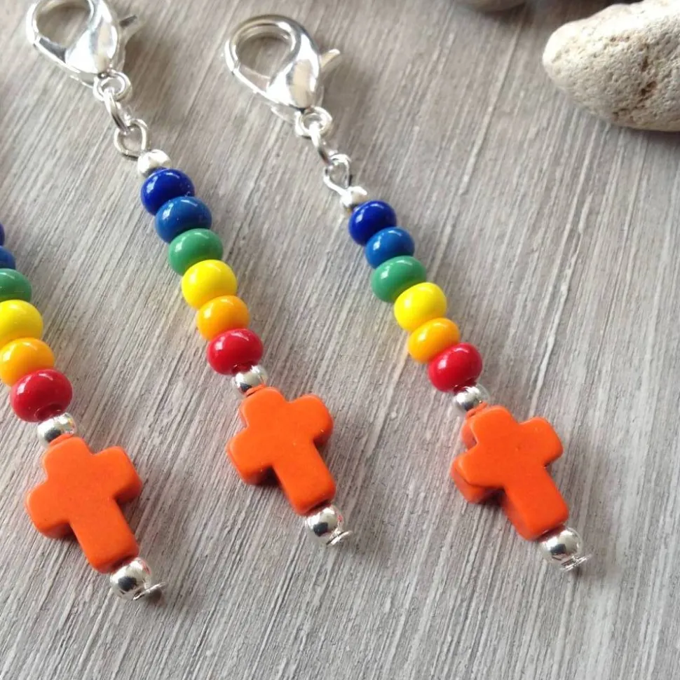 Ein orangefarbenes Howlithkreuz ( 8mm breit & 10 mm hoch ) Metallperlen und bunte Rocailles ( Durchmesser 4,5mm ) sind auf einem Nietstift aufgereiht. Dieser ist mit einer Öse an dem dunkelsilbernen Karabiner ( ca 1,4 cm hoch ) befestigt. Die Gesamtlänge beträgt ca 5,6 cm.