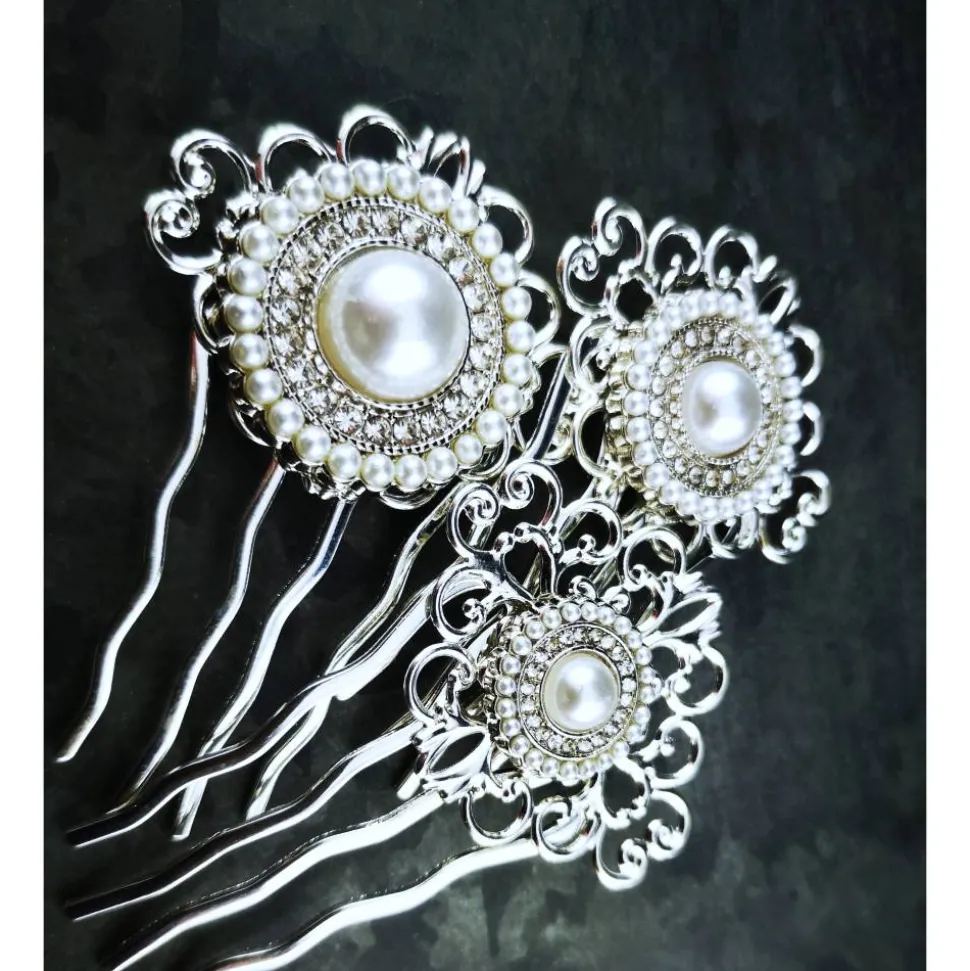 Die Haarkämme sind mit Strassknöpfen in unterschiedlichen Größen verziert und mit Harz versiegelt.