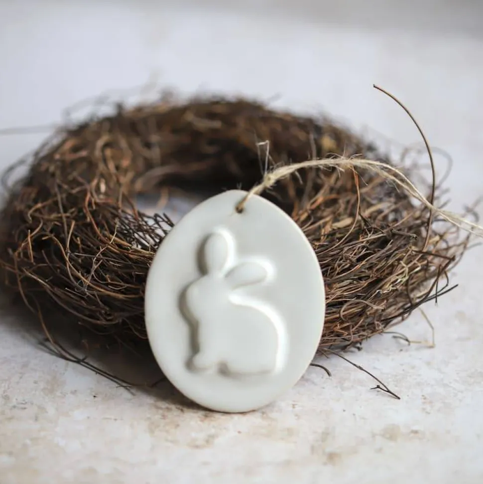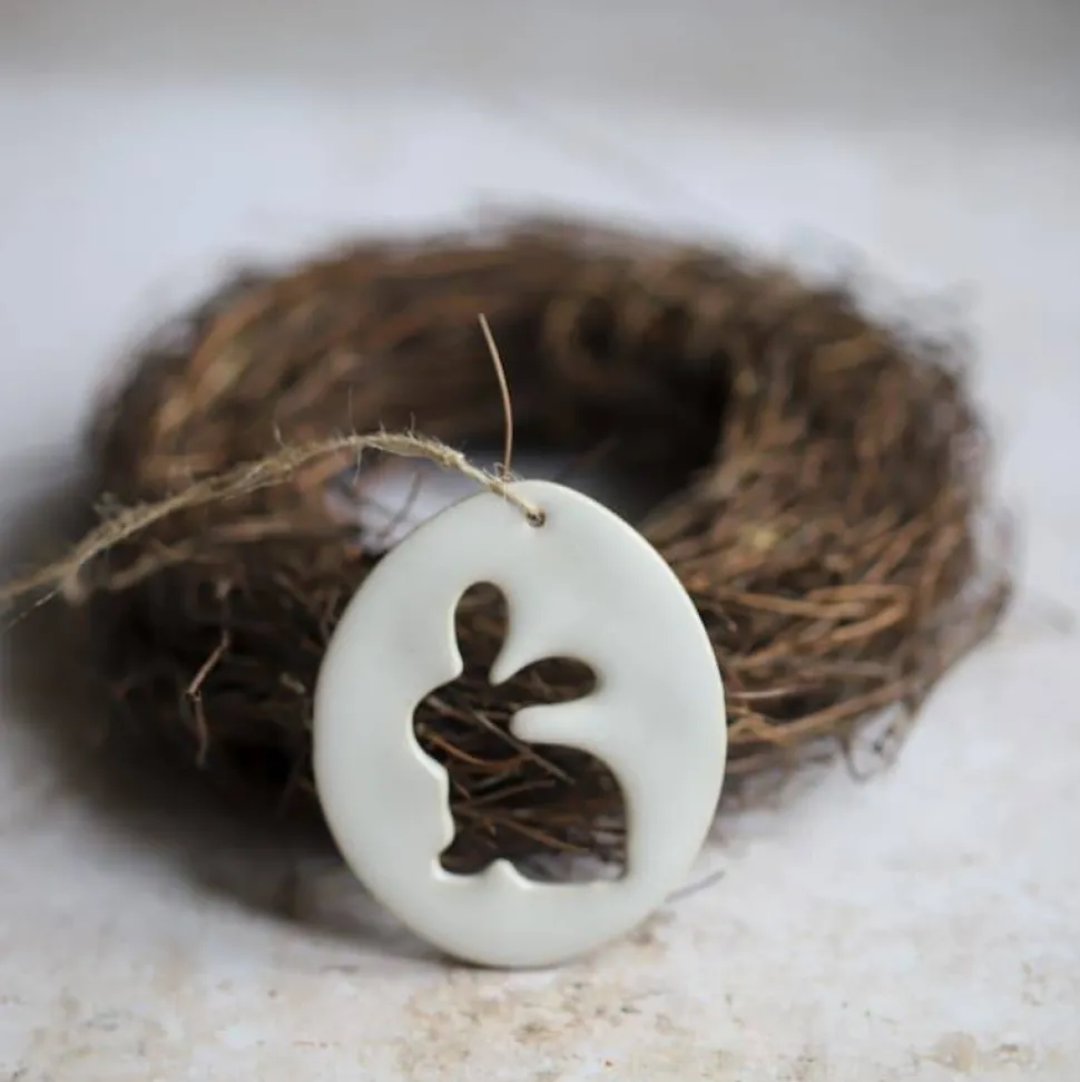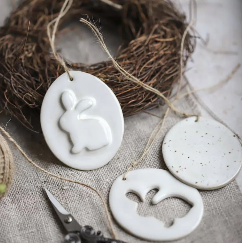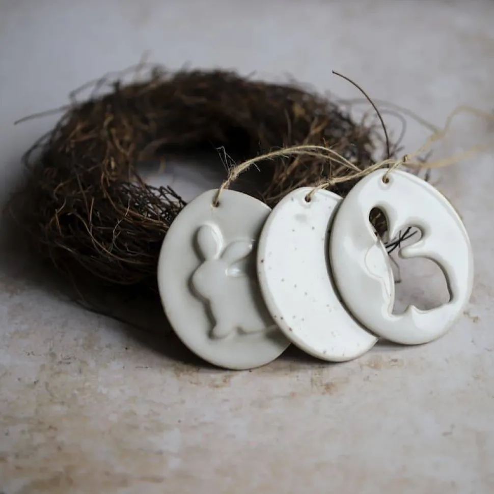 Die Anhänger sind handgetöpfert und mit weißer/ weiß-gesprenkelter Glasur glasiert. Sie kommen im Set von 3 Anhängern.
