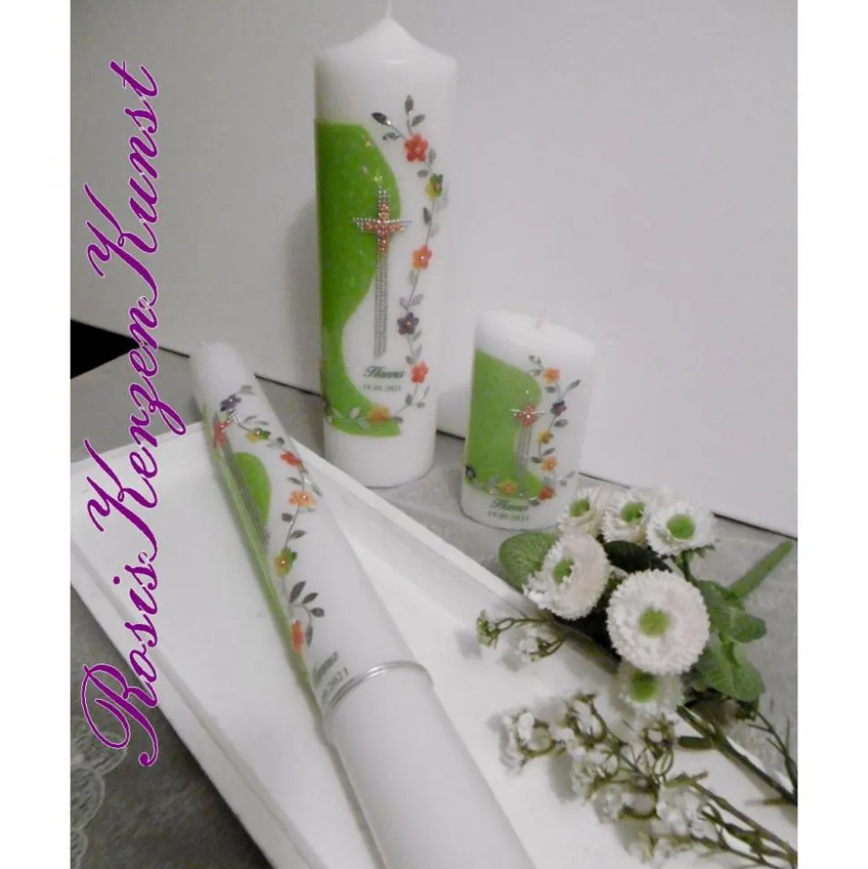 Bei dem angebotenen Kerzen-SET handelt es sich um 3 handverzierte Kerzen, die mit dem christlichen Symbol fes Kreuzes und einer bunten Blütenranke gestaltet wurden. Das Kerzendesign als auch die Farbgebung eignen sich sowohl zur Taufe als auch zur Kommunion für Mädchen und Buben. Alle 3 Kerzen sind in Vollwachsauflage gearbeitet.