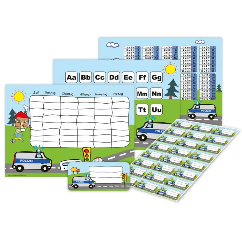 4 er Set  A4 Stundenplan + Lernposter + Heftaufkleber  | Polizei