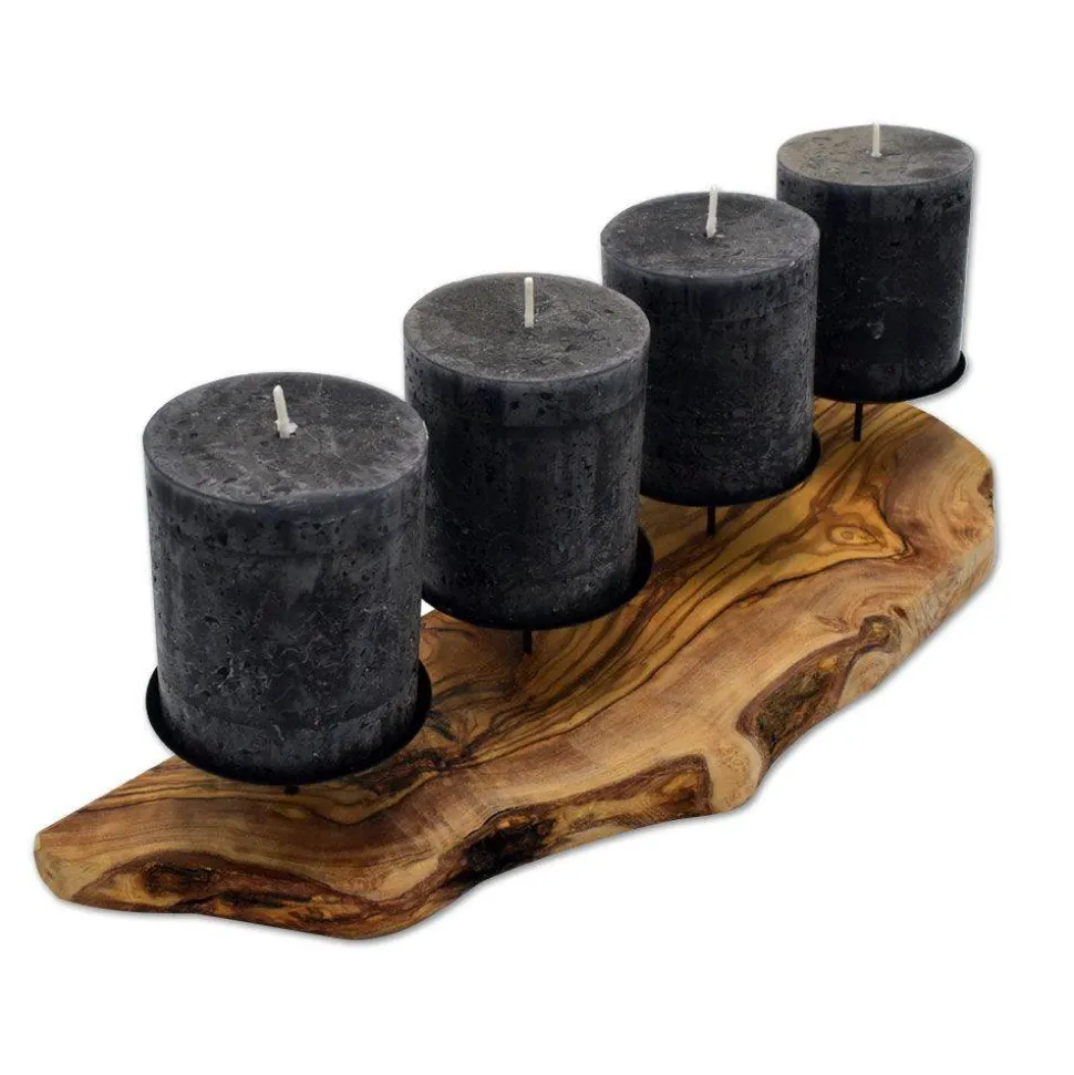 Als natürliche Version gibt es den 4er Kerzenhalter ADVENT-rustikal auf einem Brett aus Olivenholz. Für diesen tollen Kerzenhalter passen gut Stumpenkerzen mit einem Durchmesser von 68 mm, Höhe ca. 80 mm.