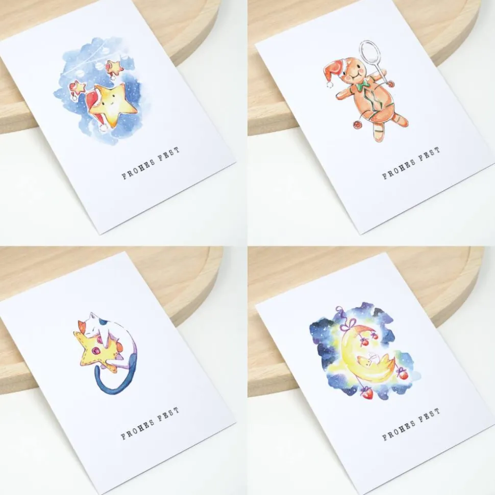 Die Charaktere von unserer kurzen Weihnachtsgeschichte sind hier als Weihnachtskarten Set zusammengestellt.
